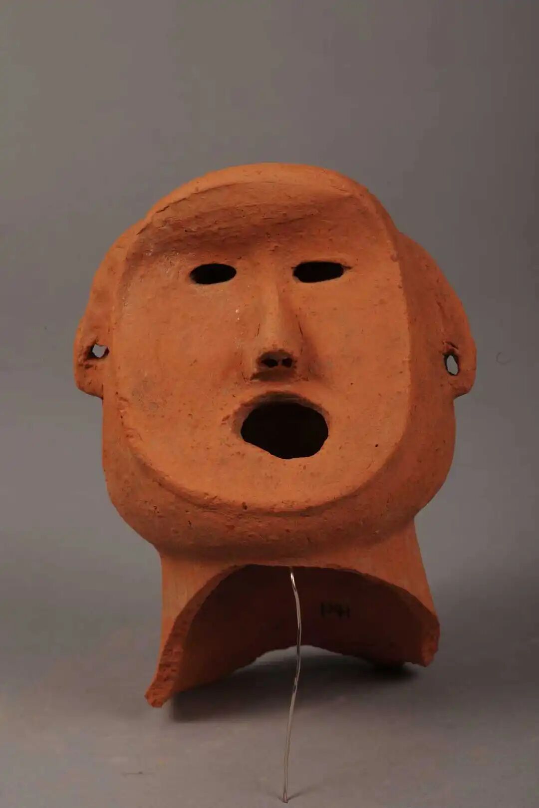 出土于鎮(zhèn)原縣三岔鎮(zhèn)高莊遺址,為泥質(zhì)紅陶。臉近圓形,額與眼眉間的分界線不明顯,鼻呈三角形隆起,嘴為扁橢圓形洞,小口微張,兩耳捏塑而成,下端各穿一個(gè)小圓孔,用來垂耳飾之用,頭稍上仰,凹面翹頜。從同出土的單耳紅陶罐、折肩高領(lǐng)甕、敞口盆等器物來看,這是新石器時(shí)代齊家文化晚期的典型藝術(shù)創(chuàng)作。1996年9月,被國家文物局鑒定專家組定為國家一級文物。