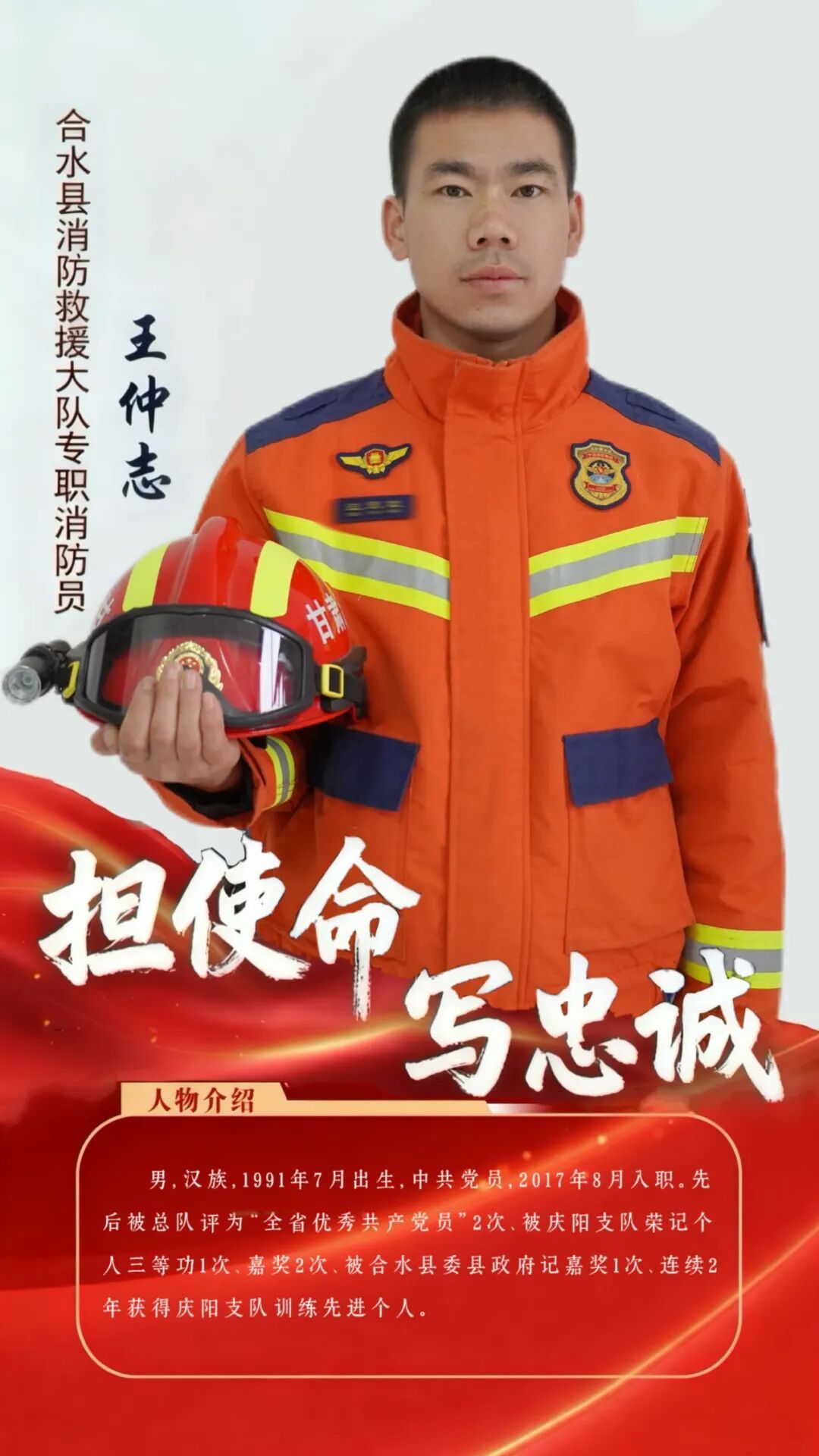 王仲志,33歲,甘肅合水人,中共黨員,2017年8月加入合水縣消防救援大隊成為一名政府專職消防員。以八年堅守詮釋“對黨忠誠、紀律嚴明、赴湯蹈火、竭誠為民”的誓言,先后被總隊評為“全省優(yōu)秀共產(chǎn)黨員”2次、被慶陽支隊榮記個人三等功1次嘉獎2次、被合水縣委、縣政府記嘉獎1次、連續(xù)2年獲得慶陽支隊訓(xùn)練先進個人,多次參加支隊舉辦的比武對抗并取得名次。