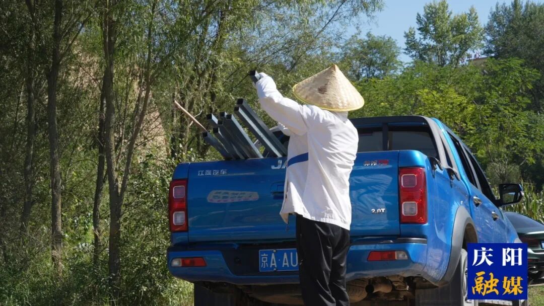 劉德成從車上取下稻種標(biāo)識(shí)牌。西峰融媒記者 豆苗 攝
