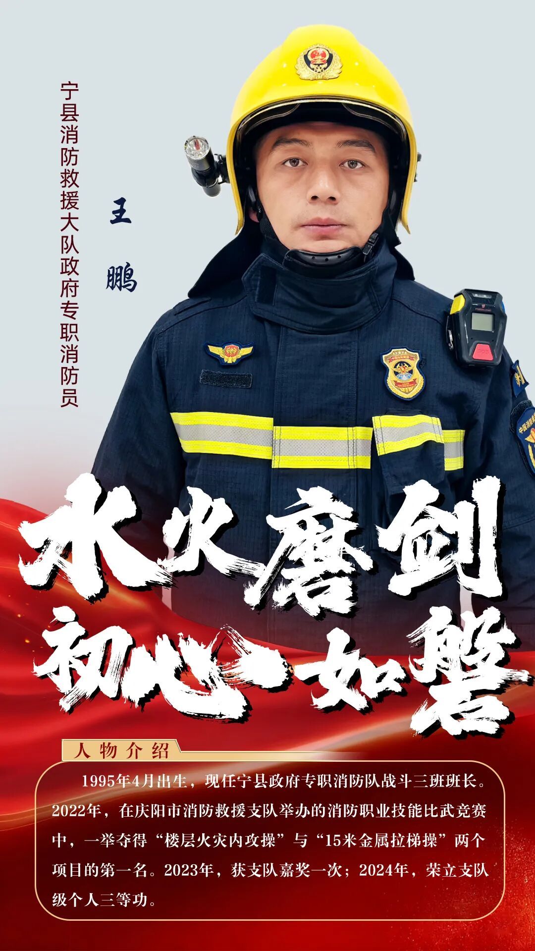 在習(xí)近平總書(shū)記為國(guó)家綜合性消防救援隊(duì)伍授旗并致訓(xùn)詞七周年之際,慶陽(yáng)市消防救援支隊(duì)重溫光輝時(shí)刻,倍感使命光榮、責(zé)任千鈞。七年來(lái),全市消防救援隊(duì)伍始終以訓(xùn)詞精神為根本遵循,牢牢把握“主力軍、國(guó)家隊(duì)”的職能定位,積極適應(yīng)“全災(zāi)種、大應(yīng)急”的任務(wù)要求,在一次次急難險(xiǎn)重任務(wù)中淬煉忠誠(chéng),在守護(hù)民生民安一線砥礪擔(dān)當(dāng),涌現(xiàn)出一大批忠誠(chéng)履職、群眾認(rèn)可的先進(jìn)典型。為集中展示新時(shí)代“火焰藍(lán)”的昂揚(yáng)風(fēng)貌,發(fā)揮榜樣示范引領(lǐng)作用,特推出先進(jìn)典型風(fēng)采展,激勵(lì)廣大指戰(zhàn)員見(jiàn)賢思齊,以更加昂揚(yáng)的斗志和嶄新的姿態(tài),續(xù)寫(xiě)消防救援事業(yè)新篇章!