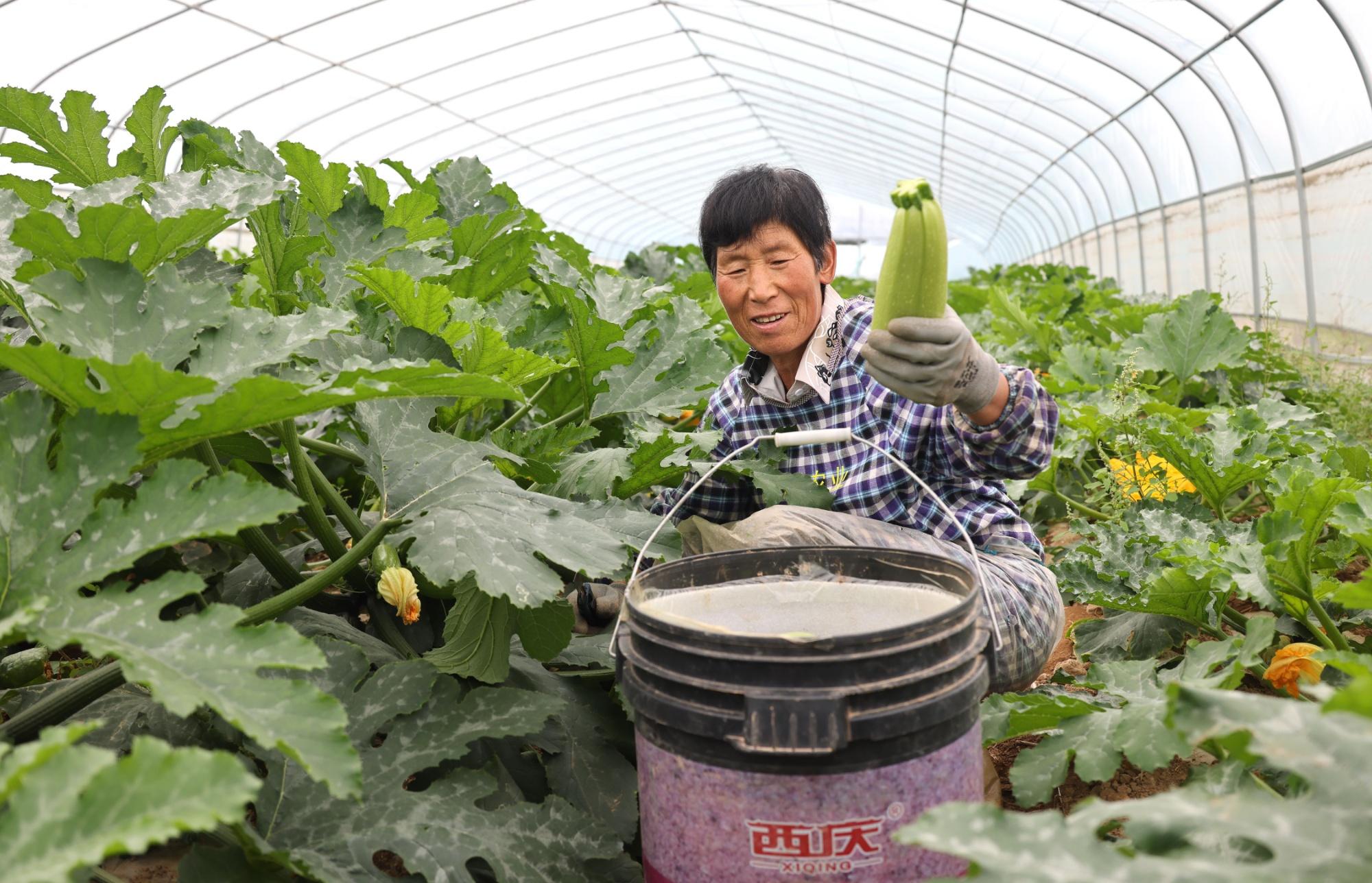 西峰區(qū)溫泉鎮(zhèn)齊樓村設(shè)施蔬菜基地工人采摘西葫蘆(盤(pán)小美 攝)