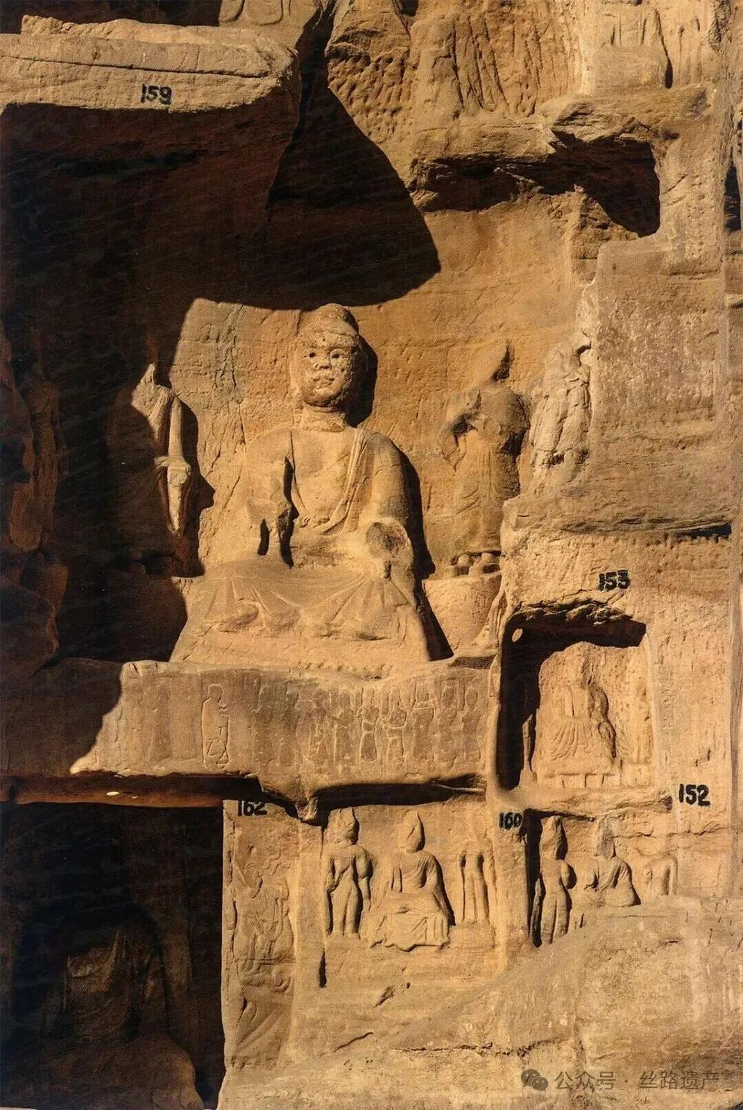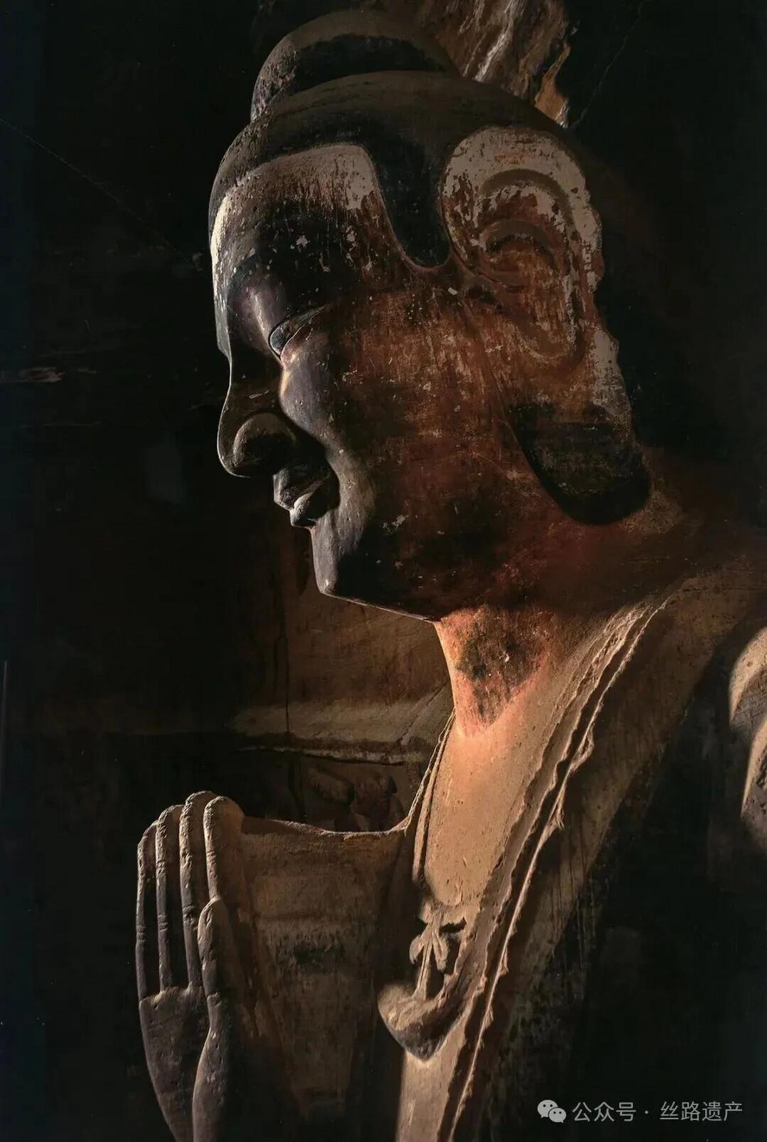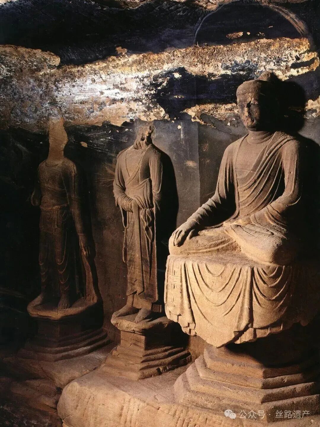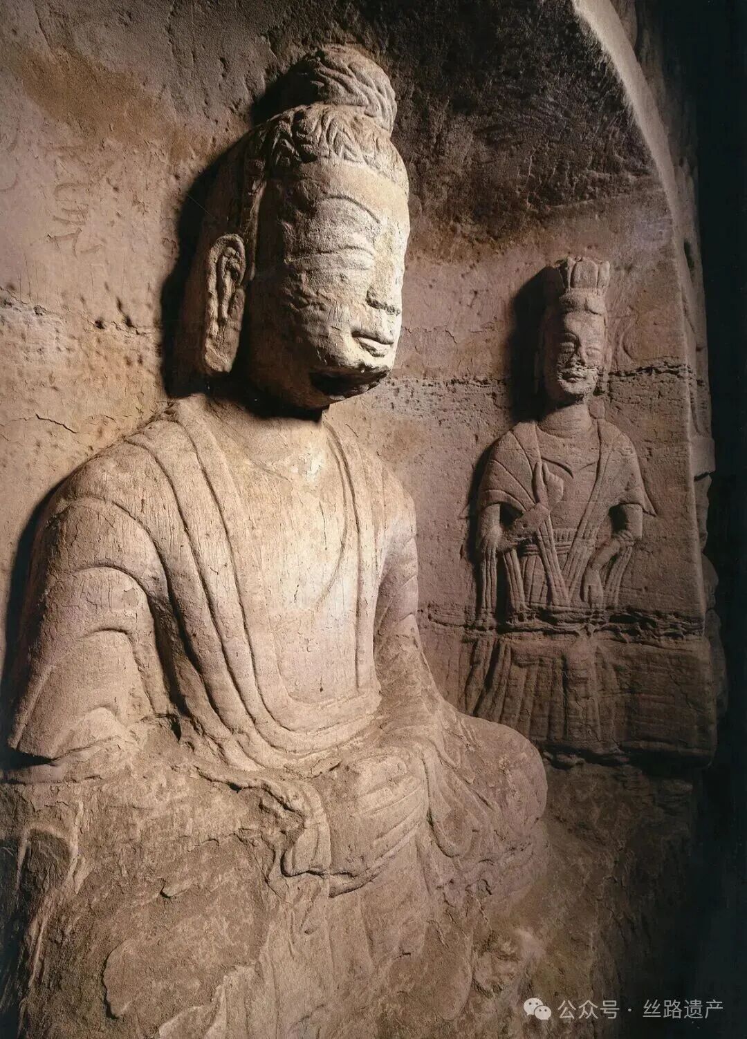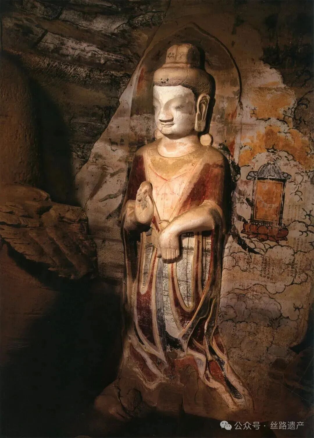 如北魏第165窟的造像受中原文化的影響較大,其佛像豐圓的面龐,壯實的身軀,厚重的褒衣博帶式袈裟,莊重肅穆的神情等都很接近云岡三期石窟和龍門石窟賓陽中洞的造像,但又融入了獨特的地域風(fēng)格。第165窟佛與菩薩比例成倍增大,佛高8米,菩薩高4米,非常夸張地反映了佛與菩薩等級與地位的不同。第165窟的七身立佛,分布在三個壁面,每個佛身后鑿舟形淺龕,七佛二彌勒的組合十分對稱。在雕刻技藝上,采取粗獷奔放與生動細(xì)膩相結(jié)合的手法,既概括洗練,又嚴(yán)謹(jǐn)不茍,給人以莊嚴(yán)大方和樸實淳厚之感。七佛嚴(yán)謹(jǐn)對稱的布局,雄偉壯觀,莊重不凡,令人肅然起敬。乘象菩薩和阿修羅天,構(gòu)思新穎,匠心獨運。菩薩安詳?shù)刈谙蟊成?,其恬靜優(yōu)美的姿態(tài)與慈祥和藹的微笑,使人頗感可親可敬。菩薩身后的比丘,淳樸而又虔誠,身前的馭象奴神色嚴(yán)厲。佛的護法阿修羅天多頭多臂,手持日月,張臂舉杵。古代工匠并沒有完全按照佛經(jīng)上描述去雕刻,而是僅僅通過洗練硬直的刀法,概括地顯示出他震撼天地的威力和氣吞山河的氣概。這種充滿想象和夸張的浪漫主義的表現(xiàn)手法,相當(dāng)具有特點。