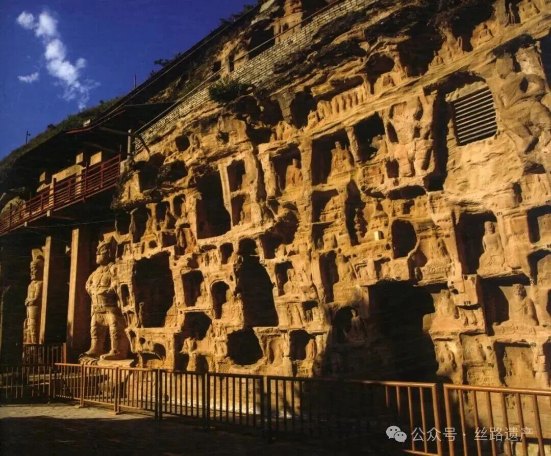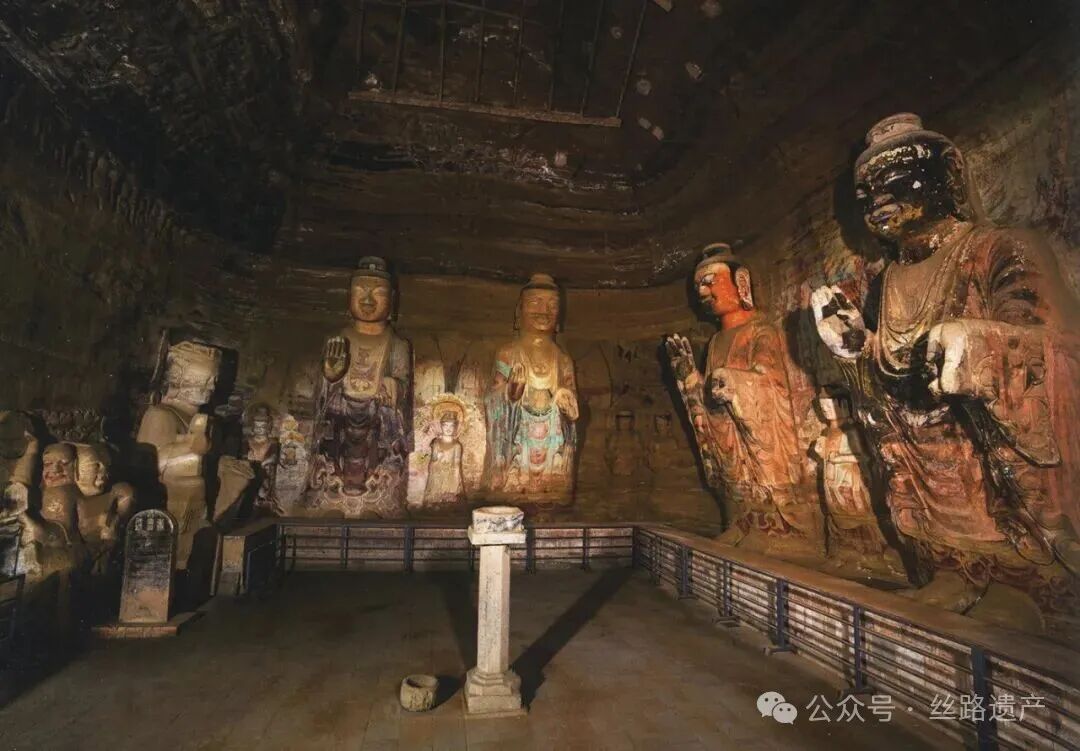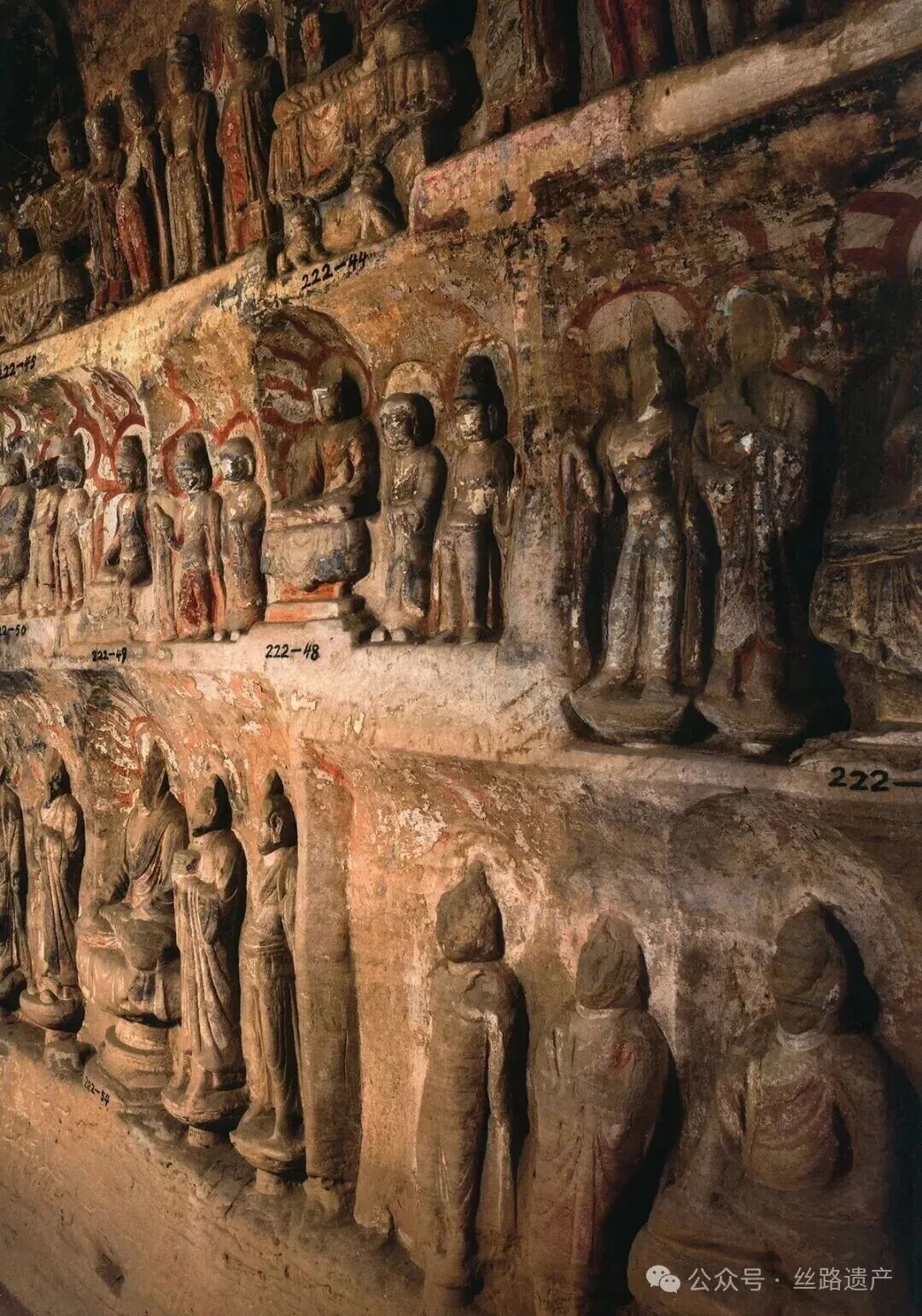 北石窟寺位于甘肅省慶陽市西峰區(qū)西南25千米處的覆鐘山砂巖崖面上。在北魏時期就開始了佛教石窟的營建。此后,歷代鐫修不止,歷經(jīng)西魏、北周、隋、唐、宋代,現(xiàn)存窟龕308個,佛教造像兩千余軀。其中第165窟是北石窟寺中時代最早、規(guī)模最大和內(nèi)容最豐富的代表窟,北魏永平二年(509)由當(dāng)時的涇州刺史奚康生主持營建,洞窟平面為橫長方形,高達(dá)14.6米,南北寬21.7米,進(jìn)深15.7米??邇?nèi)造像以七佛為主體,輔之以脅侍菩薩、彌勒菩薩、普賢菩薩、阿修羅、千佛及佛傳、佛本生故事等。七身佛像均高達(dá)8米,造型莊重,氣勢宏偉;旁邊的菩薩、阿修羅等也形象生動、富有個性??咧羞€有浮雕本生故事、佛傳故事等豐富內(nèi)容,體現(xiàn)出北魏時期佛教雕刻藝術(shù)的重要成就。
