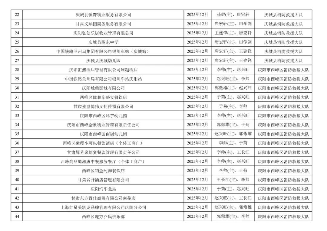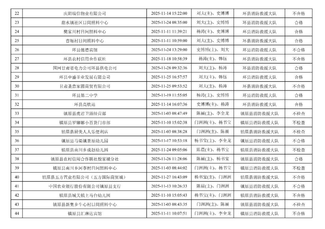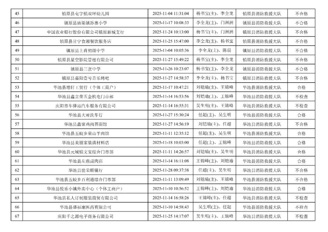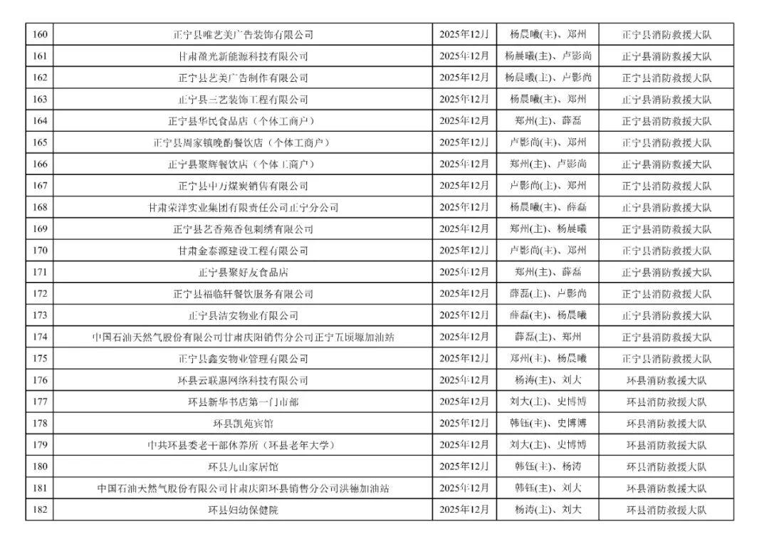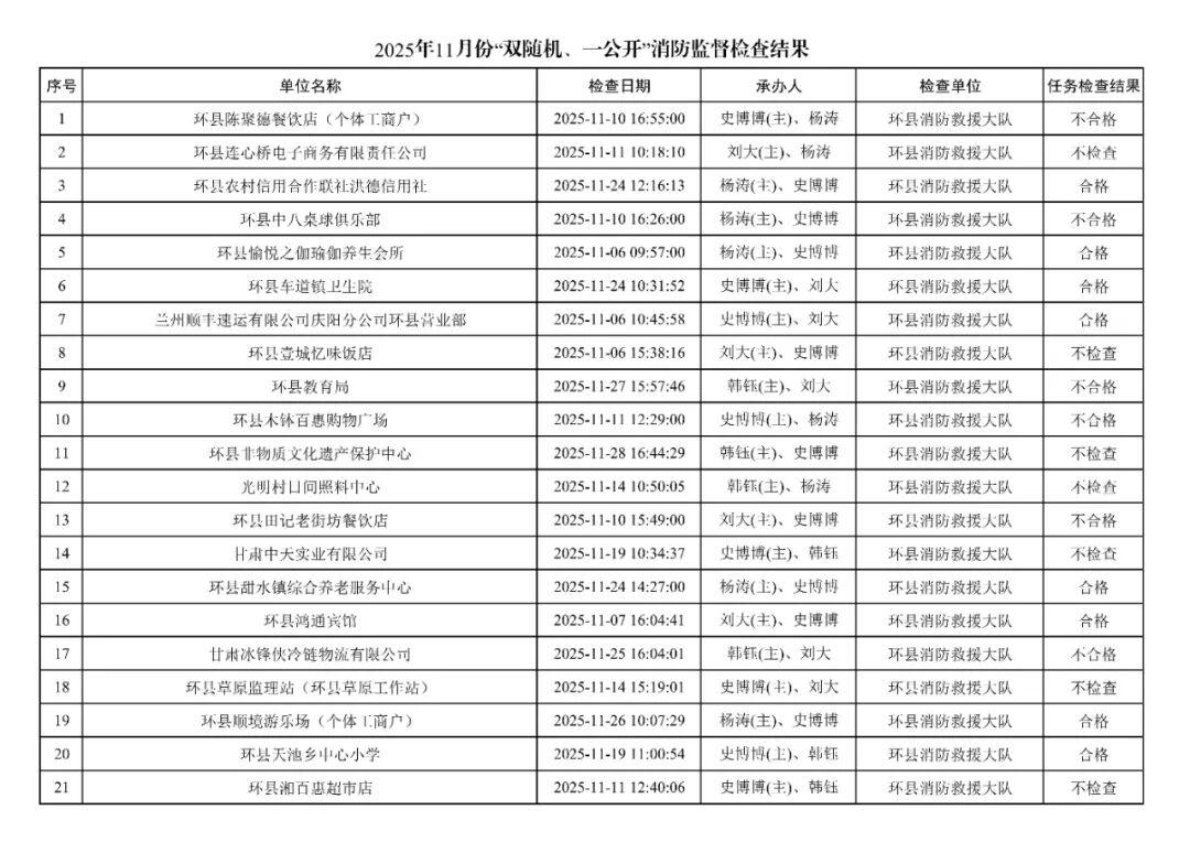 為貫徹落實《消防救援局關于全面推行“雙隨機、一公開”消防監(jiān)管工作的通知》(應急消〔2019〕241號),認真組織實施“雙隨機、一公開”消防監(jiān)管工作,現(xiàn)將2025年11月份“雙隨機、一公開”消防監(jiān)督檢查結果及12月份監(jiān)督抽查計劃公示如下: