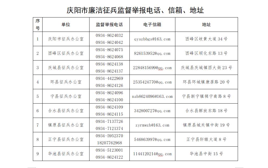 現(xiàn)將全市廉潔征兵監(jiān)督員和市縣兩級廉潔征兵監(jiān)督舉報電話信箱進(jìn)行公示,接受應(yīng)征青年和家長反映違反征兵紀(jì)律規(guī)定現(xiàn)象。