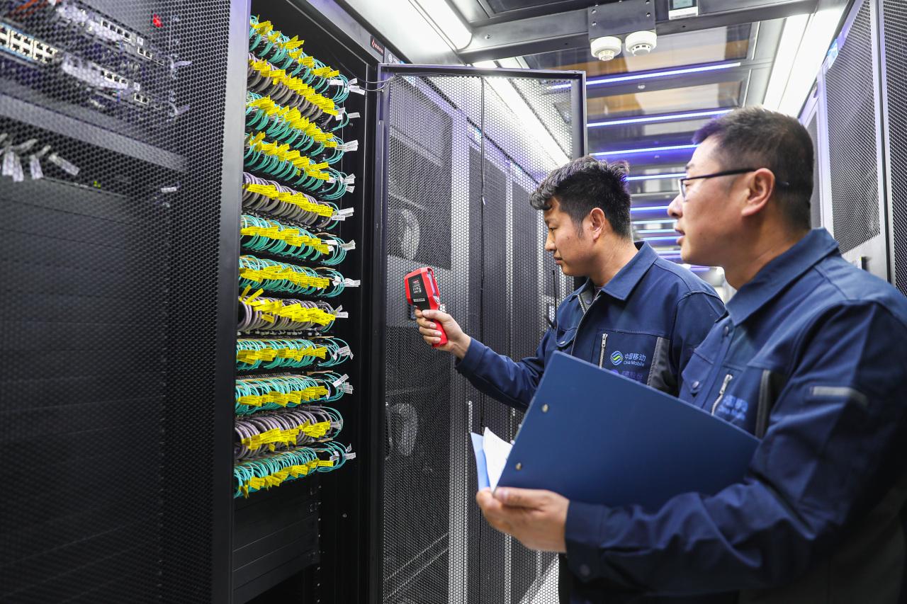 工作人員在中國移動(甘肅·慶陽)數據中心巡檢。(資料圖)
