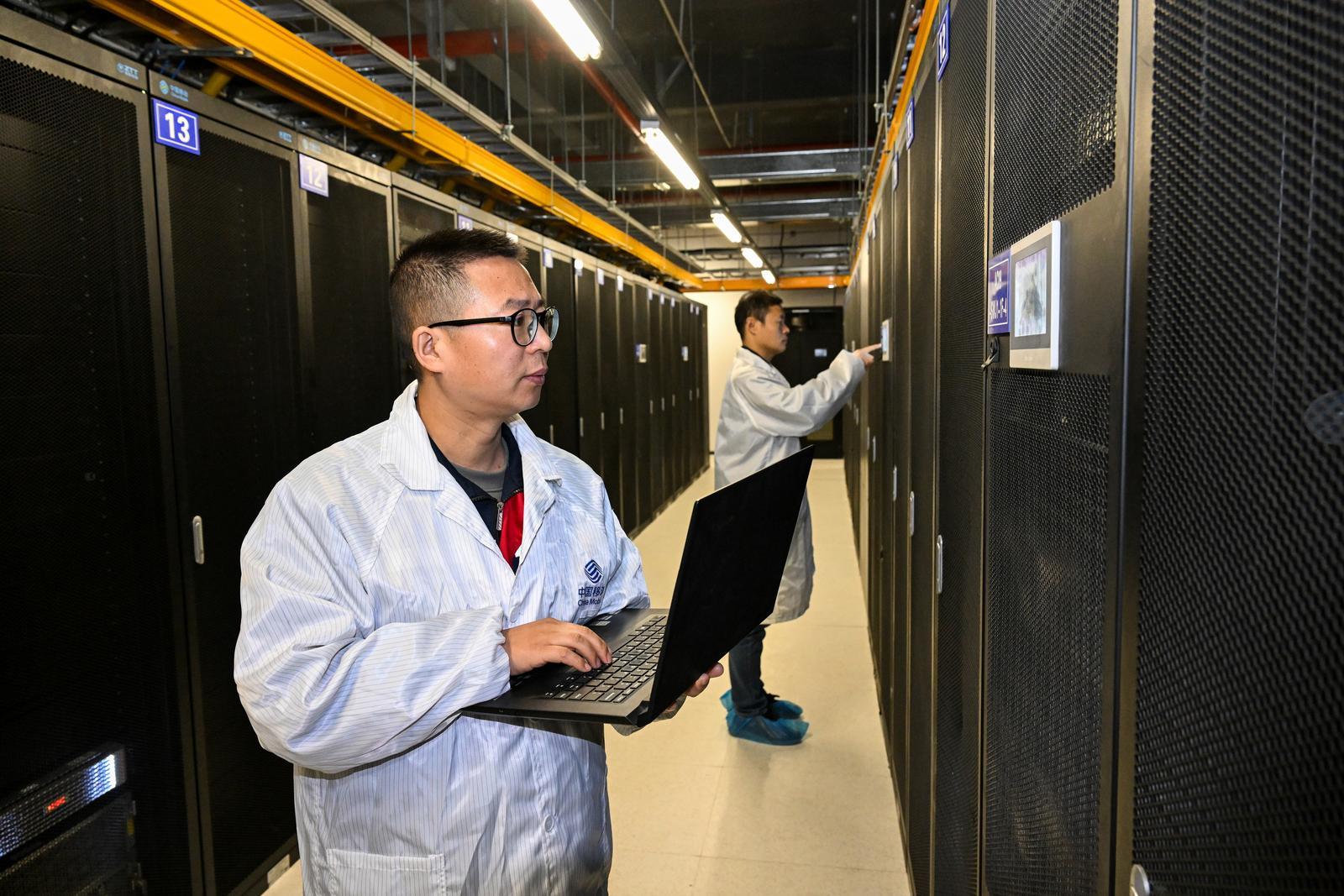中國移動(甘肅·慶陽)綠色智算中心,技術人員在IDC機房檢查設備運行情況。 慶陽融媒記者 俄少飛 攝