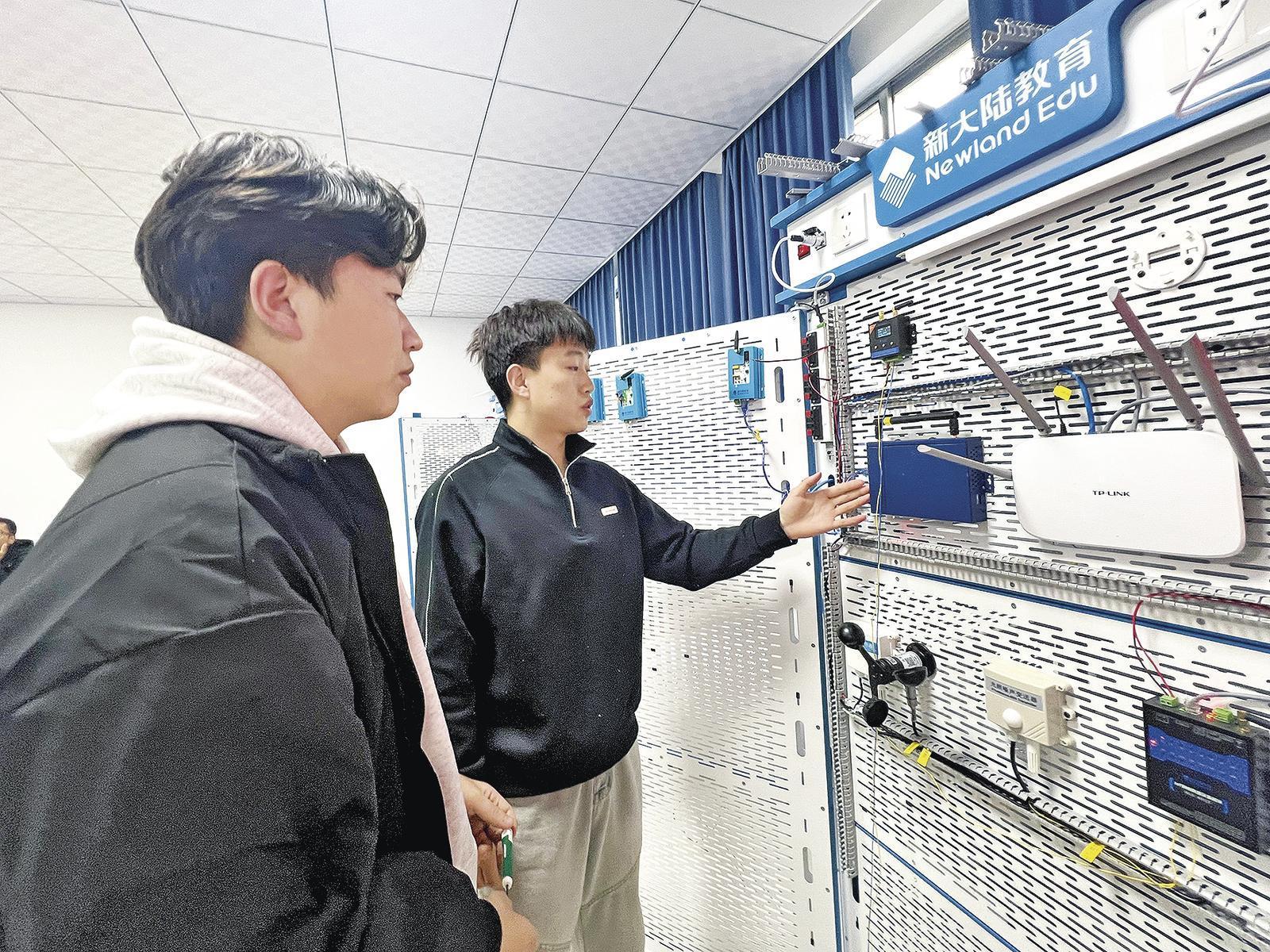 在與新大陸科技集團(tuán)共建的物聯(lián)網(wǎng)實(shí)訓(xùn)中心,學(xué)生在調(diào)試傳感器。新大陸時(shí)代科技有限公司的物聯(lián)網(wǎng)工程師彭銳博指著工作臺(tái)上的設(shè)備清單介紹道:“這個(gè)項(xiàng)目完全按照企業(yè)真實(shí)流程進(jìn)行,學(xué)生需要完成從傳感器選型到云端數(shù)據(jù)部署的全鏈條操作。我們主要配合學(xué)校做好師資培訓(xùn)、課程建設(shè)、課程資源開發(fā)以及校企合作的課題開發(fā),還為學(xué)校提供物聯(lián)網(wǎng)行業(yè)實(shí)訓(xùn)課程,分享行業(yè)案例、技術(shù)及工具?!?nbsp;