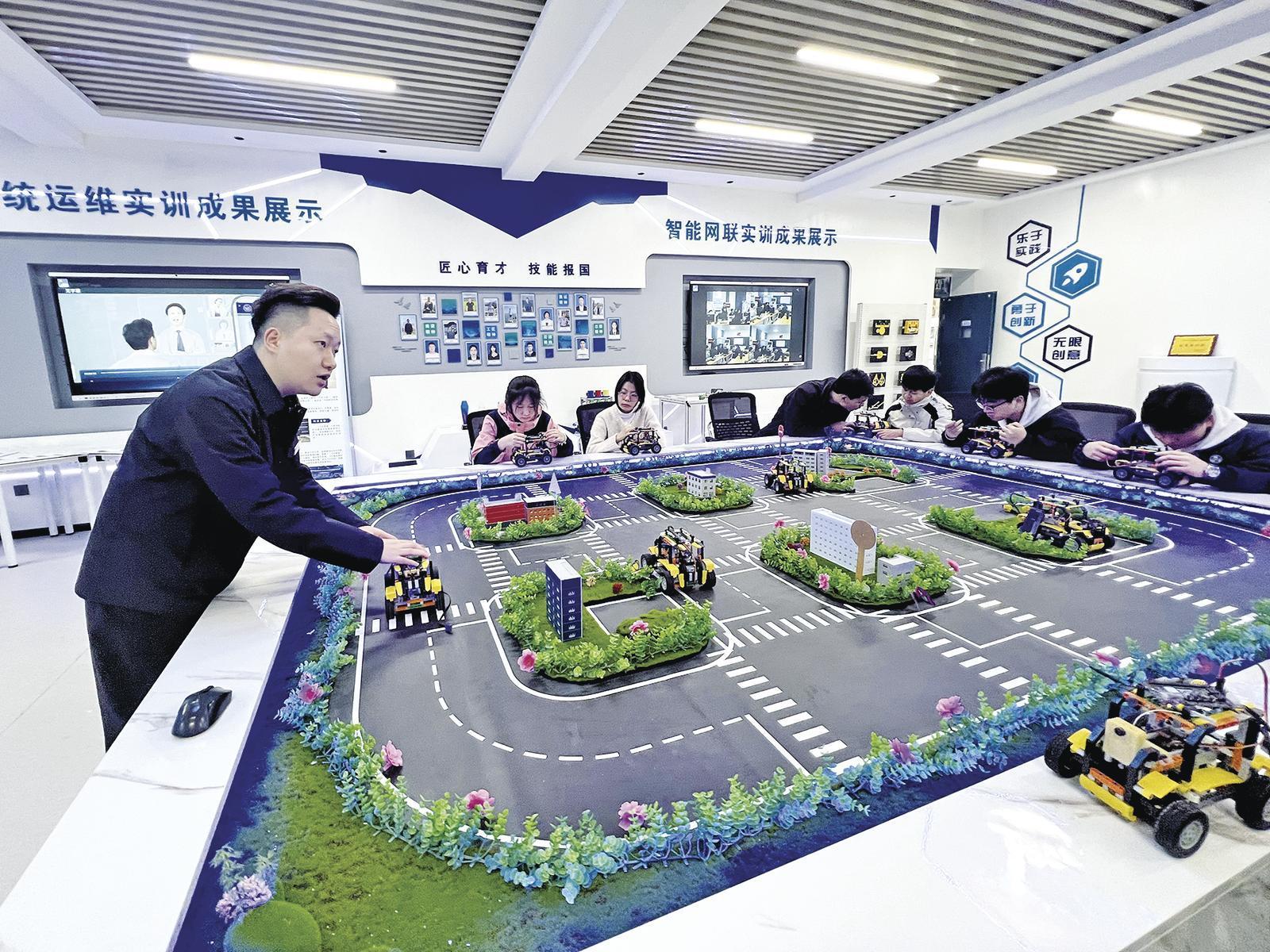 在人工智能實(shí)訓(xùn)區(qū),競賽指導(dǎo)教師張斌軒指著人工智能小車演示沙盤介紹道:“我們從去年9月開始,就面向全校44個(gè)不同專業(yè)的學(xué)生開設(shè)人工智能通識(shí)課程。”該系還同步建成系統(tǒng)運(yùn)維、大數(shù)據(jù)技術(shù)、人工智能、軟件技術(shù)、智能網(wǎng)聯(lián)等多個(gè)實(shí)訓(xùn)中心,為學(xué)生提供真實(shí)的實(shí)操環(huán)境。