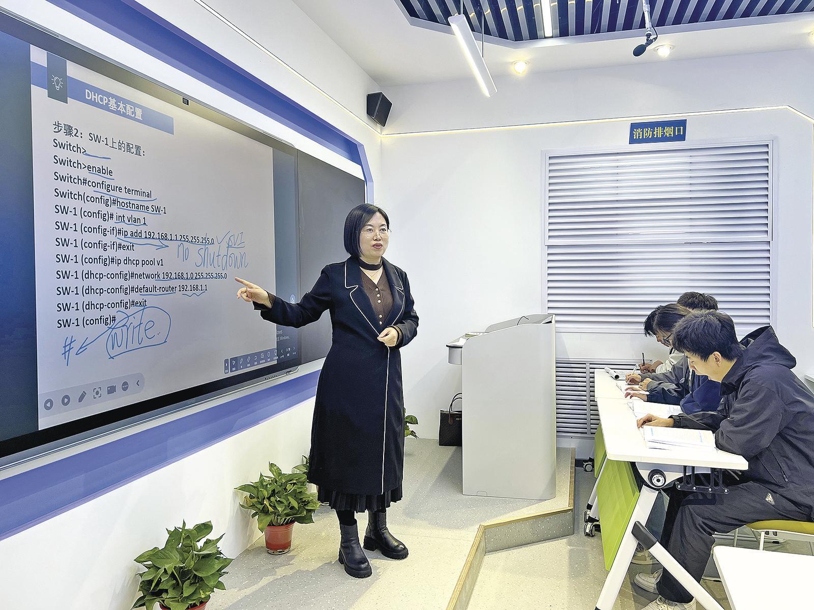新大陸時(shí)代科技有限公司物聯(lián)網(wǎng)工程師彭銳博給學(xué)生上實(shí)訓(xùn)課。 慶陽融媒記者 王華 攝