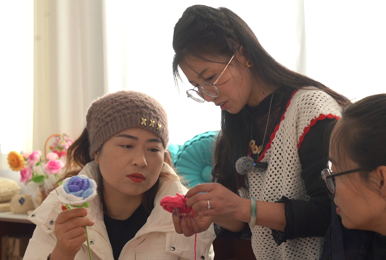 每個(gè)工作日的下午,工坊里都坐滿了學(xué)員。蘇芳從最基礎(chǔ)的針法教起,耐心解答每一個(gè)問題。學(xué)員李彩榮是首批學(xué)員之一,她說:“一開始連針都拿不好,是蘇老師一步步帶著我,告訴我怎么用力、怎么繞線。”如今,李彩榮已經(jīng)能夠獨(dú)立完成復(fù)雜的作品,并通過銷售手工編織品為家庭增加了收入。