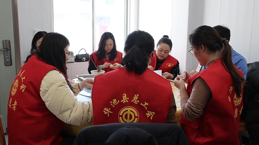 活動現(xiàn)場,縣總工會職工分工協(xié)作,和面、調(diào)餡、包餃子,動作嫻熟有序。不一會兒,一個個形態(tài)飽滿的餃子整齊排列,空氣中彌漫著餃子餡的鮮香與濃濃的溫情。