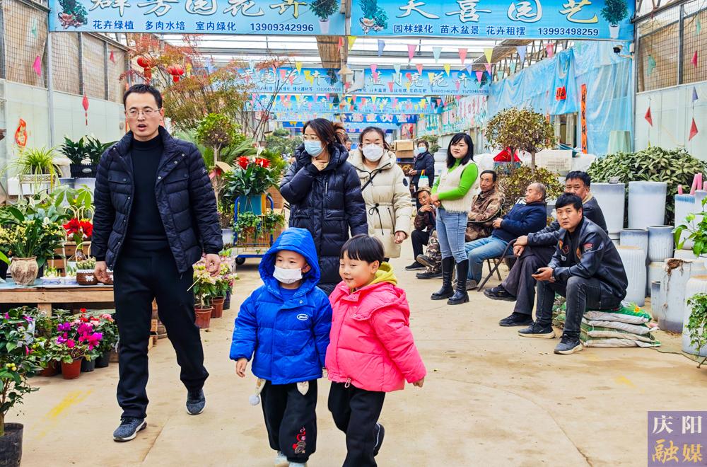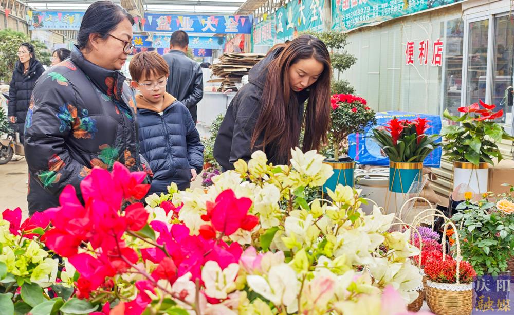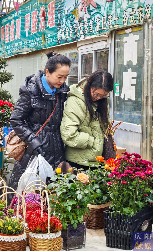 市民在西峰區(qū)天富億花卉市場(chǎng)選購(gòu)心儀盆栽。
