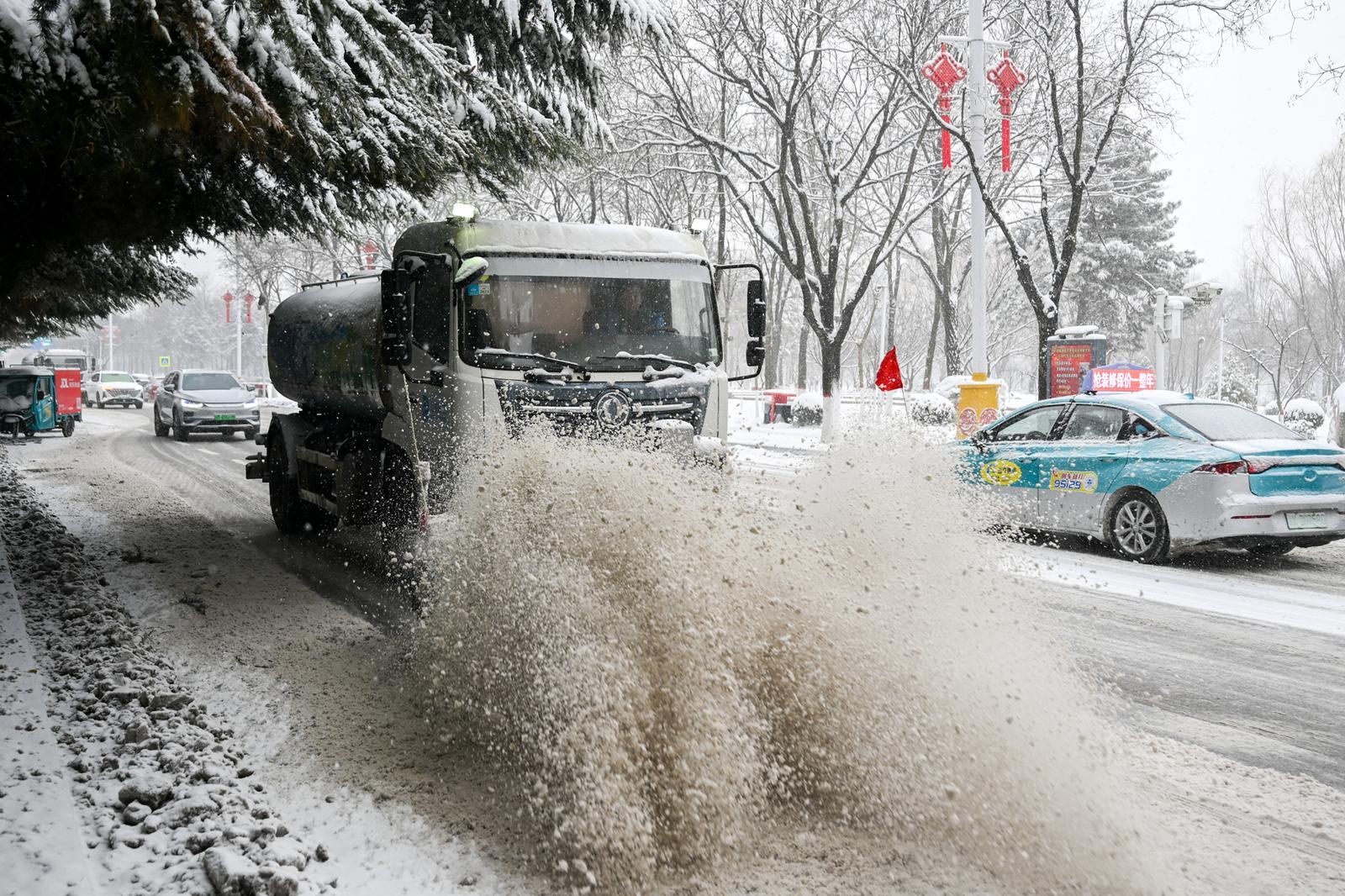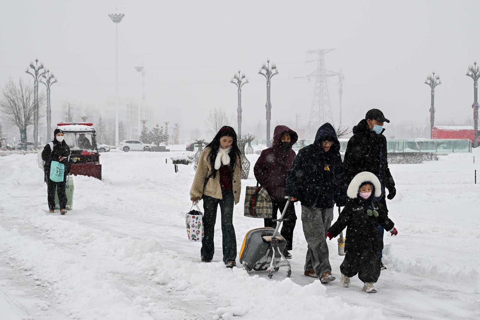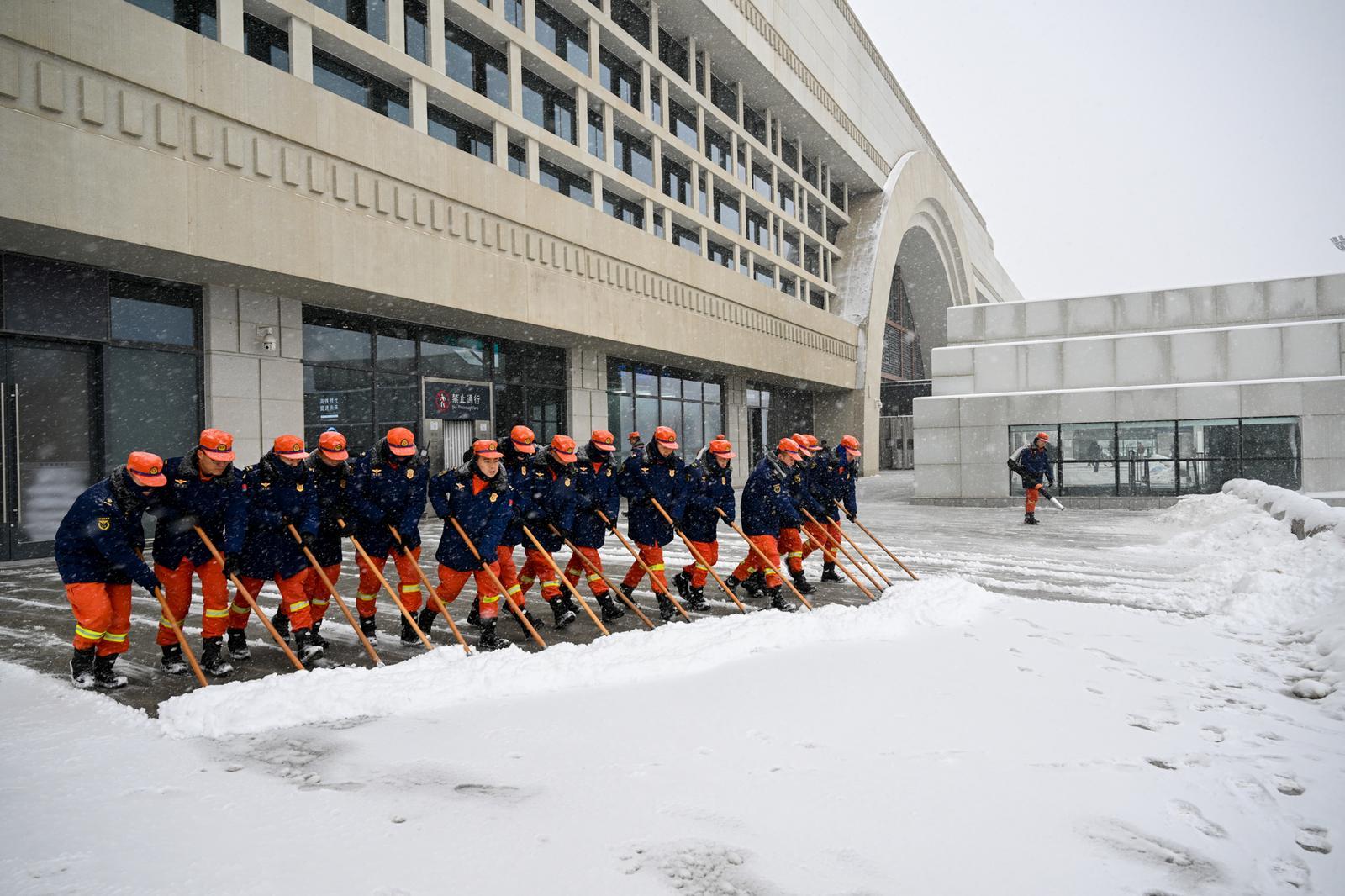 消防員清除站前廣場積雪。