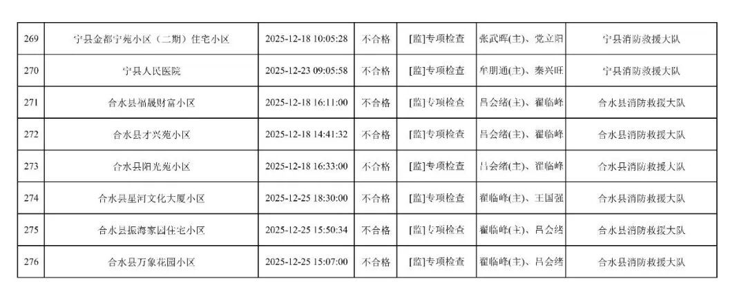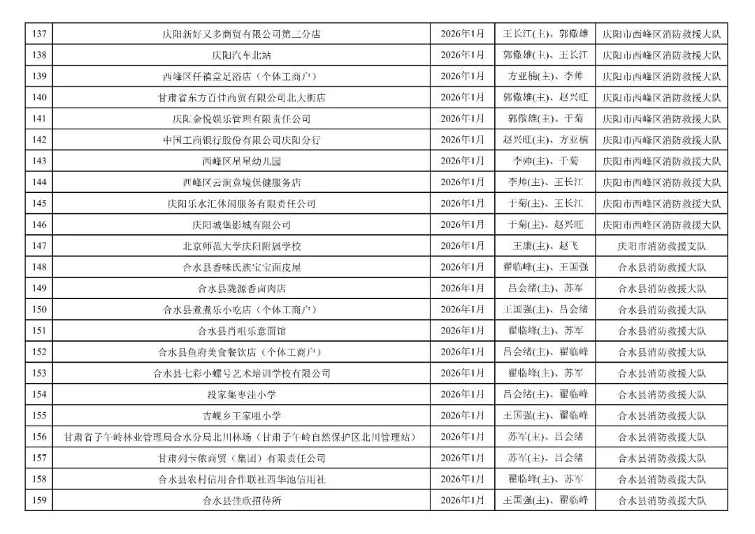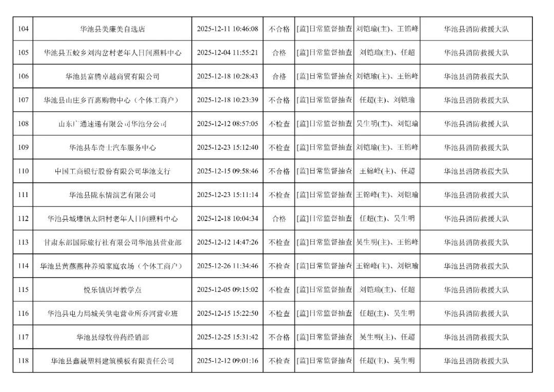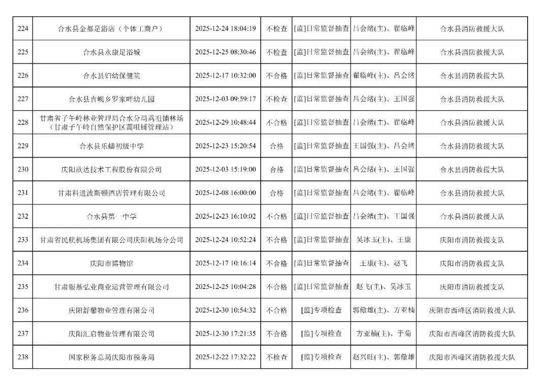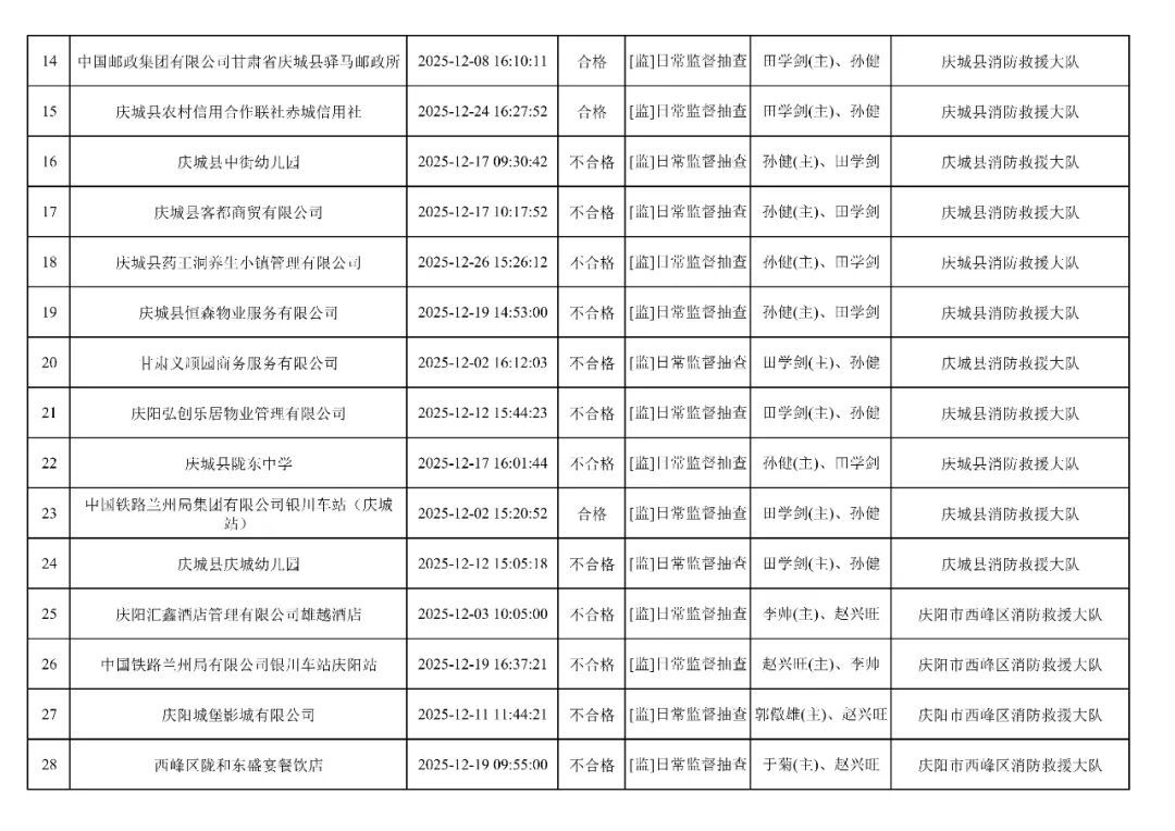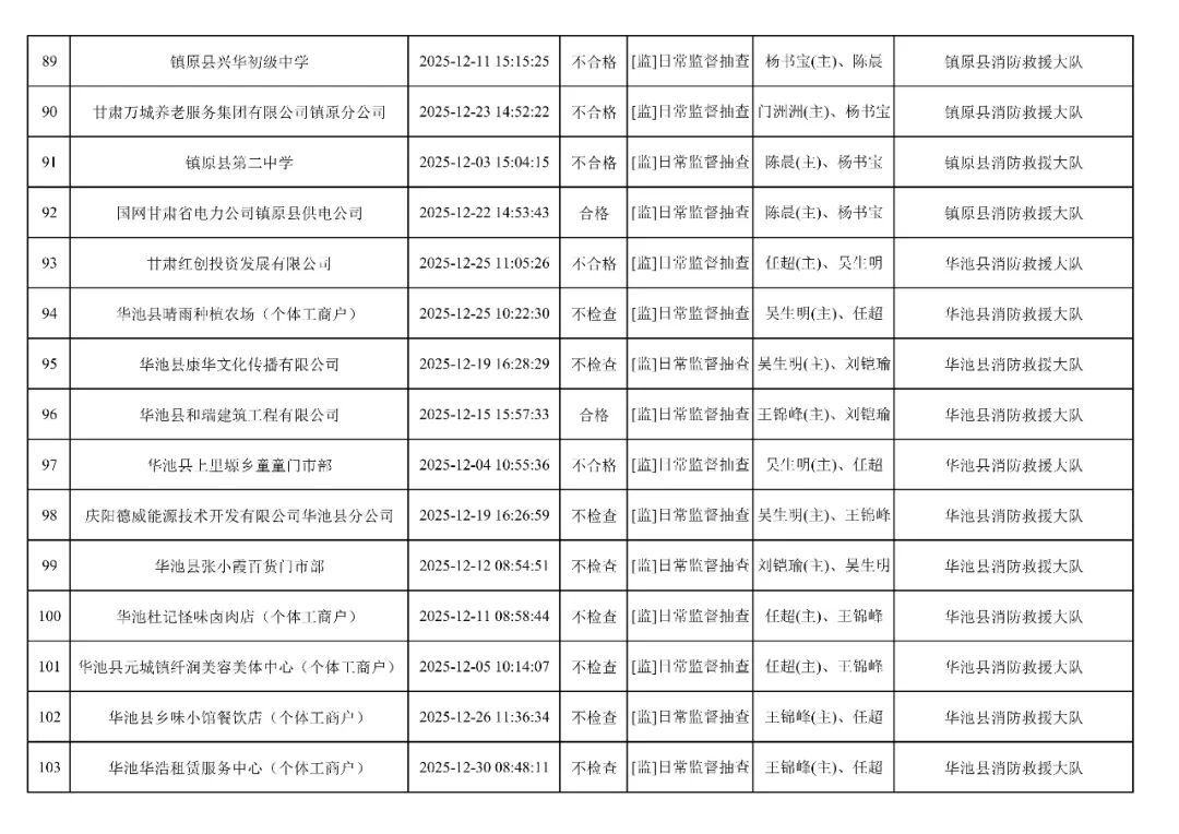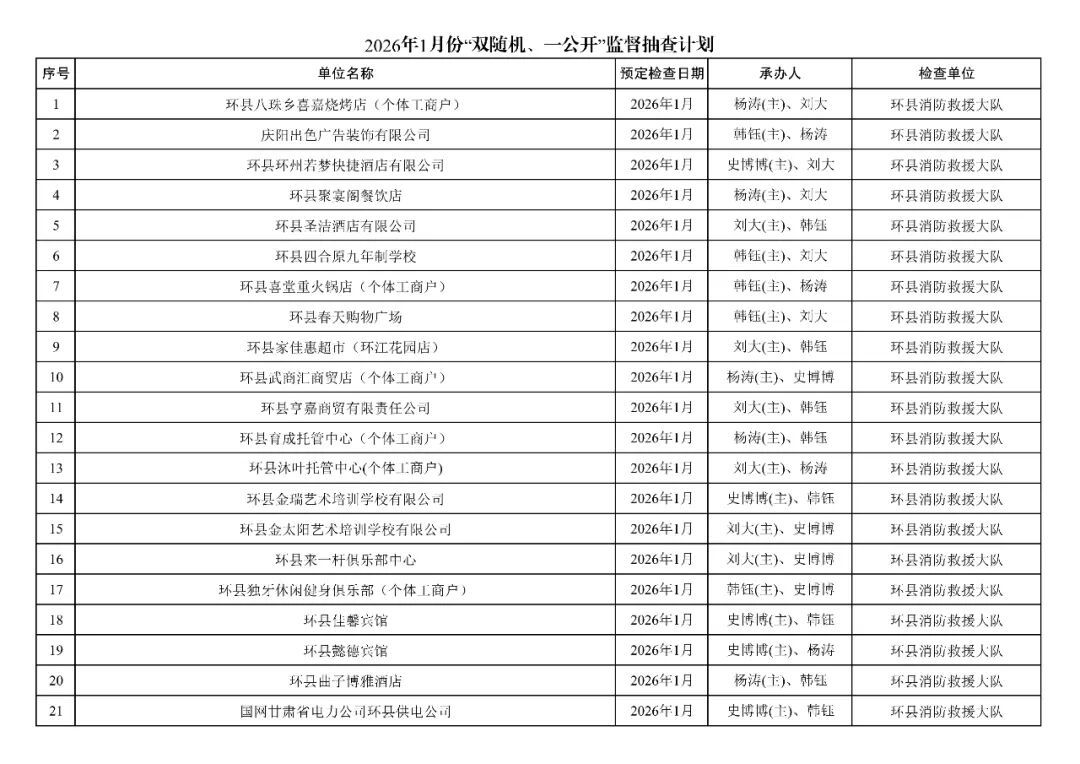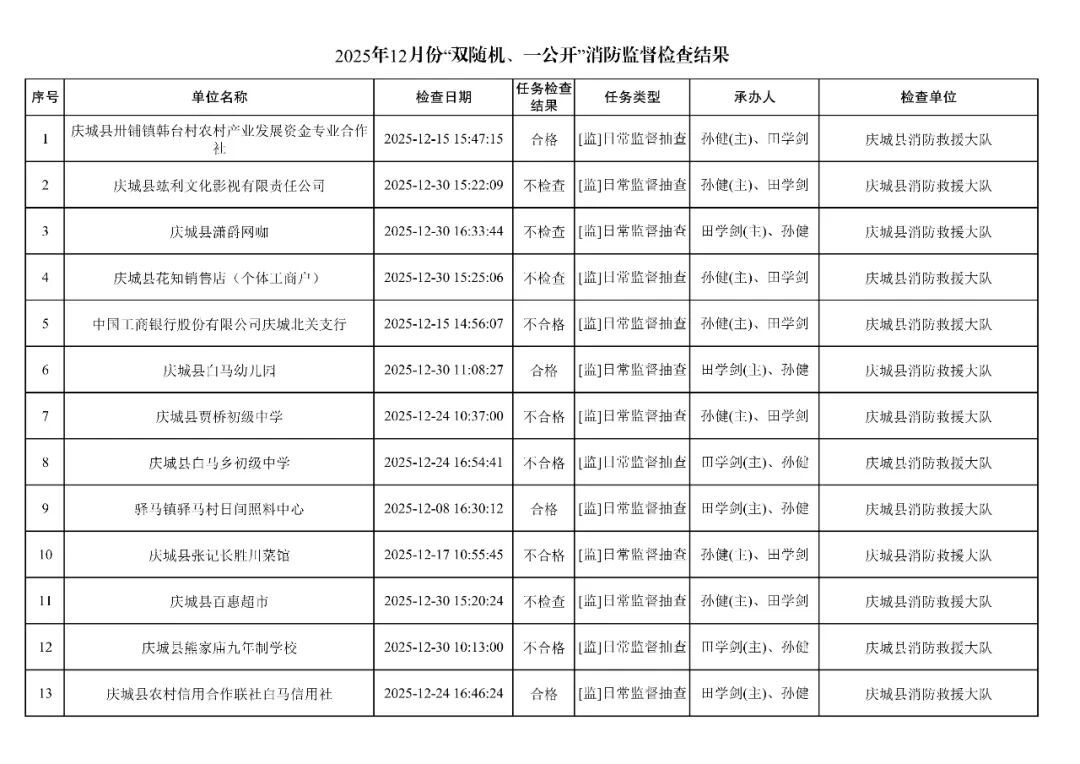 為貫徹落實(shí)《消防救援局關(guān)于全面推行“雙隨機(jī)、一公開”消防監(jiān)管工作的通知》(應(yīng)急消〔2019〕241號),認(rèn)真組織實(shí)施“雙隨機(jī)、一公開”消防監(jiān)管工作,現(xiàn)將2025年12月份“雙隨機(jī)、一公開”消防監(jiān)督檢查結(jié)果及2026年1月份監(jiān)督抽查計劃公示如下: