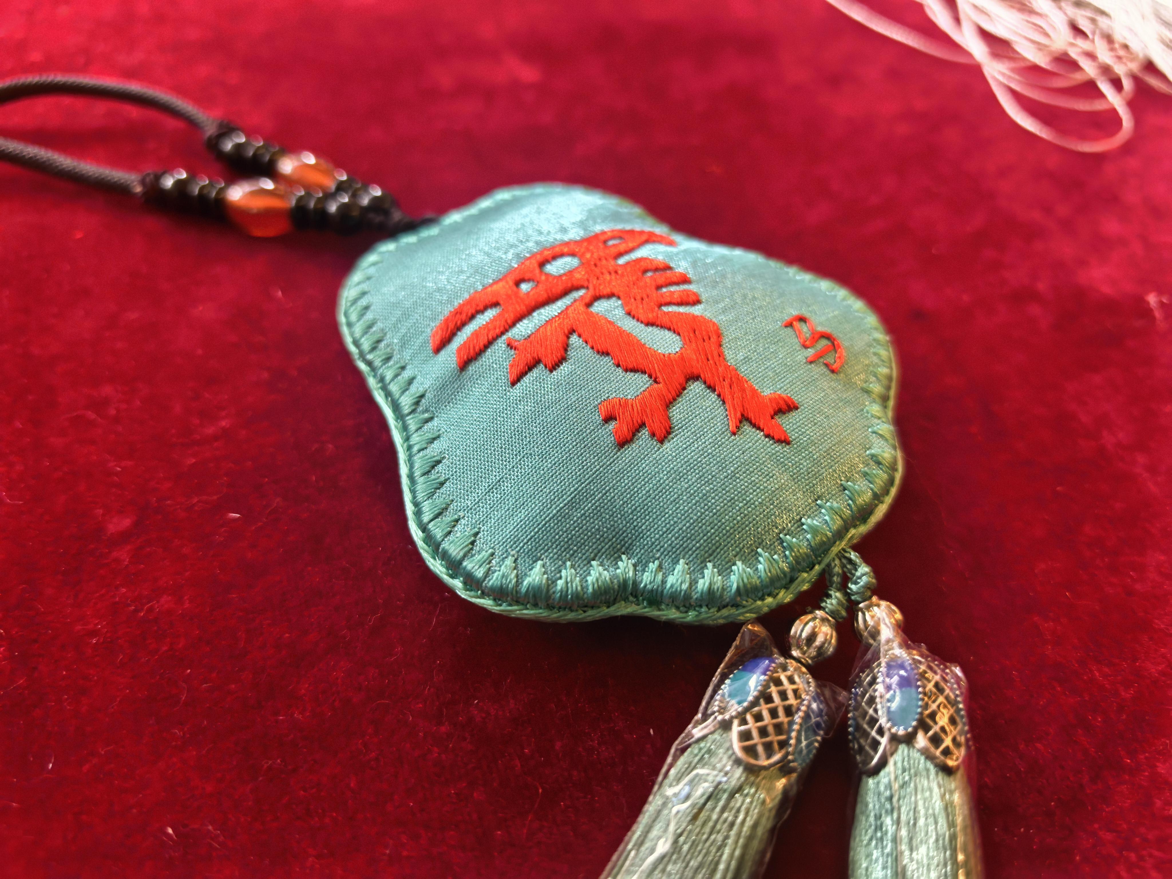 藝術(shù)館南側(cè),氣氛靜謐而專注。刺繡非遺傳承人曹偉偉指尖捏著細(xì)針,彩線在她的牽引下,在紅色錦緞上翩躚起舞。她正在縫制一個精致的福袋香包,一面是栩栩如生的刺繡奔馬,昂首奮蹄;另一面,卻是一個用絲線繡成的古樸蒼勁的甲骨文“馬”字。