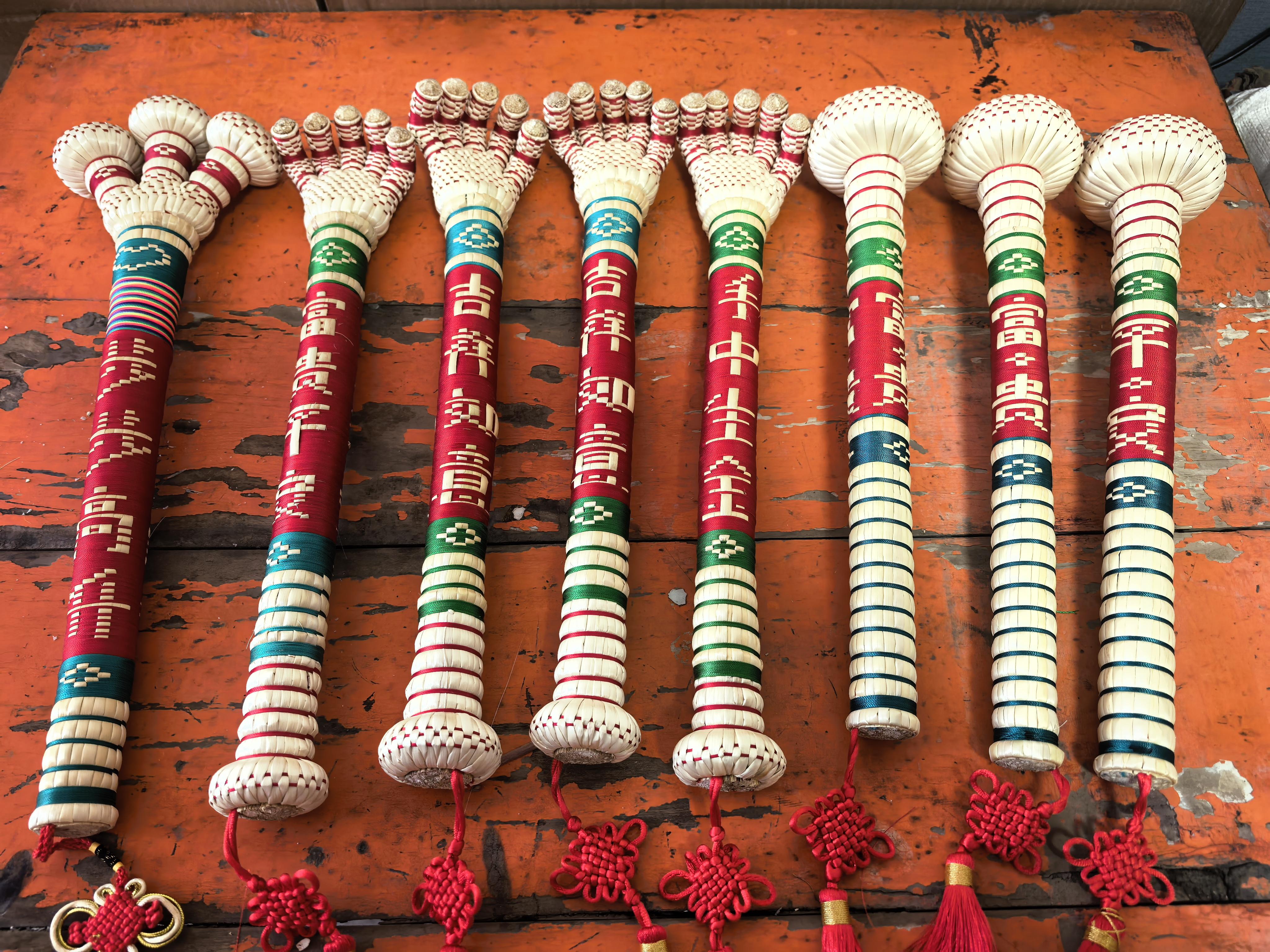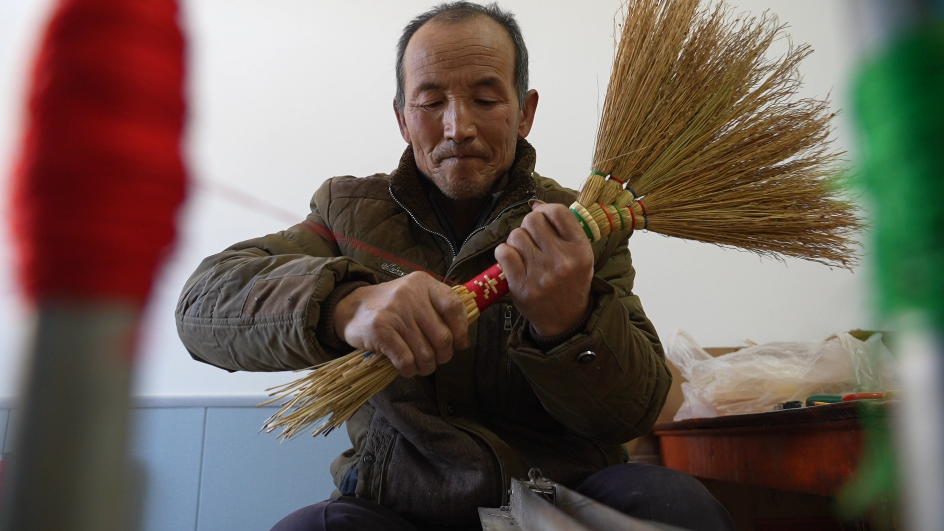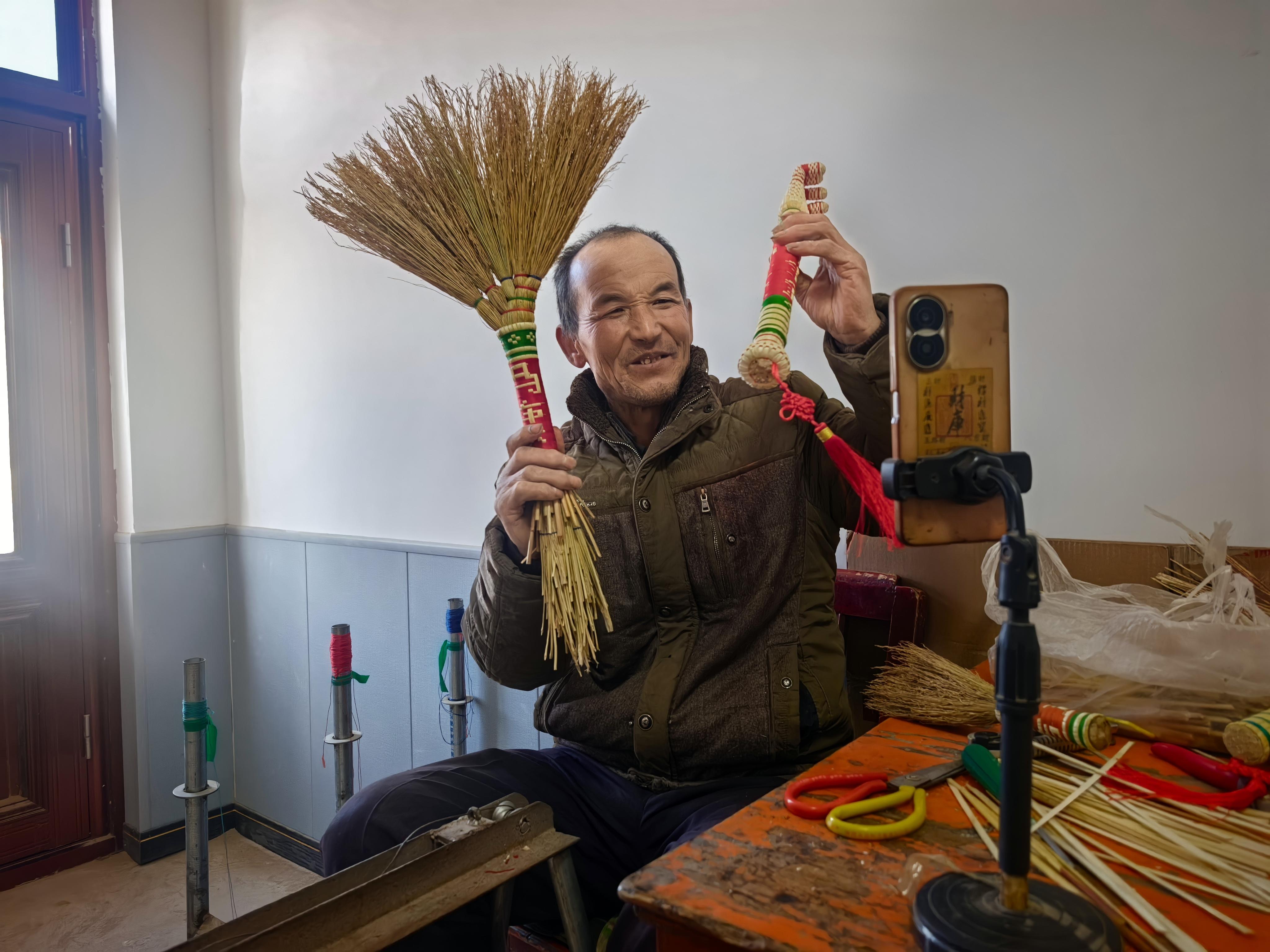 北風(fēng)掠過甘肅環(huán)縣的黃土溝壑,在李相玉新建的制作工坊里,卻是一番熱鬧景象。這位59歲的老手藝人手指翻飛,彩線在高粱稈間穿梭,正編織著“馬年大吉”的字樣。架子上掛滿了他創(chuàng)新的作品——保健捶、癢癢撓、孝順子,早已不是傳統(tǒng)笤帚的模樣。