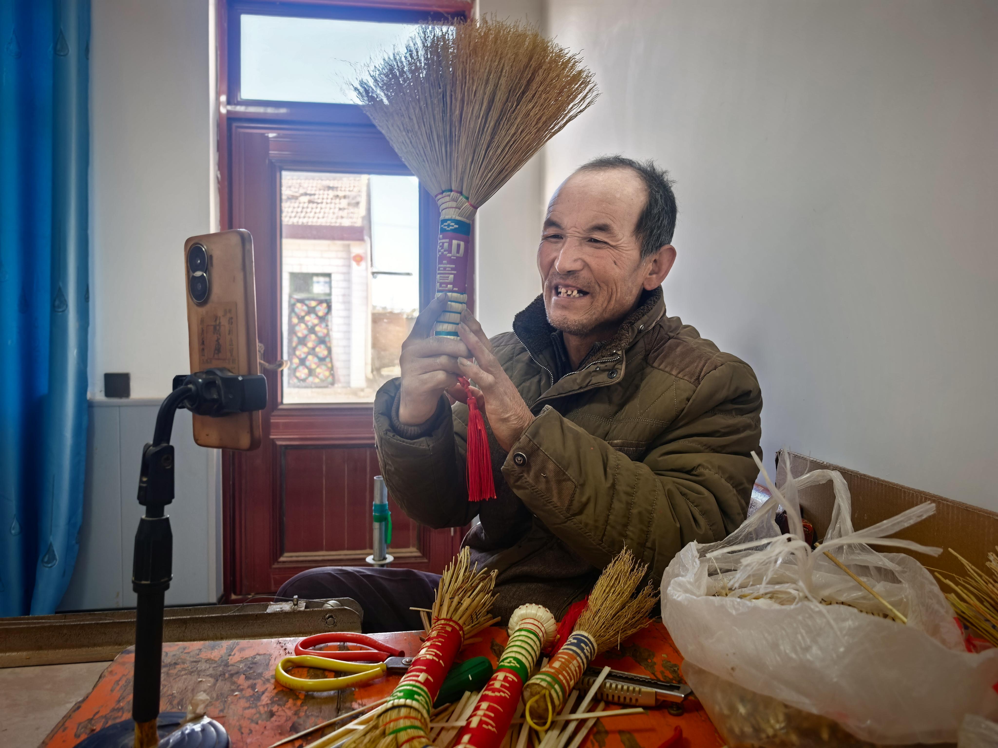 一月中旬,甘肅省環(huán)縣羅山川鄉(xiāng),寒風(fēng)掠過(guò)黃土高原的溝壑。大樹(shù)塬村北塬頭組的一間新房里,59歲的李相玉正埋頭綁扎一把五彩高粱笤帚。彩線在他指尖穿梭,漸漸在笤帚把上呈現(xiàn)出“馬年大吉”四個(gè)秀氣的字樣。房間里,上百把笤帚整齊排列——小巧玲瓏的保健捶、造型別致的癢癢撓、綴著“?!弊值膲?、精致實(shí)用的按摩棒……這些早已被預(yù)訂一空的手工藝品,即將發(fā)往北京、上海、廣州等二十多個(gè)城市。