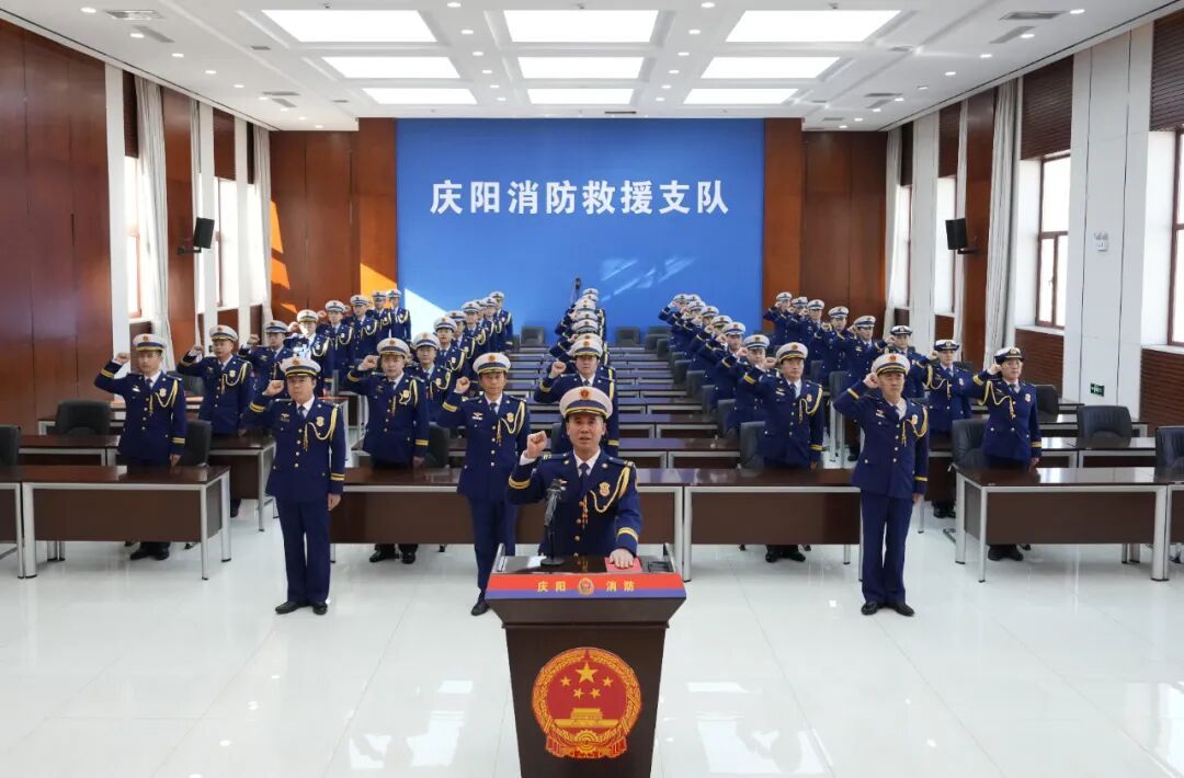 1月15日,慶陽市消防救援支隊舉行憲法宣誓儀式。支隊黨委書記、政治委員趙小龍領誓并講話,黨委委員、副支隊長沈永剛監(jiān)誓,紀檢組長張小斌主持儀式。