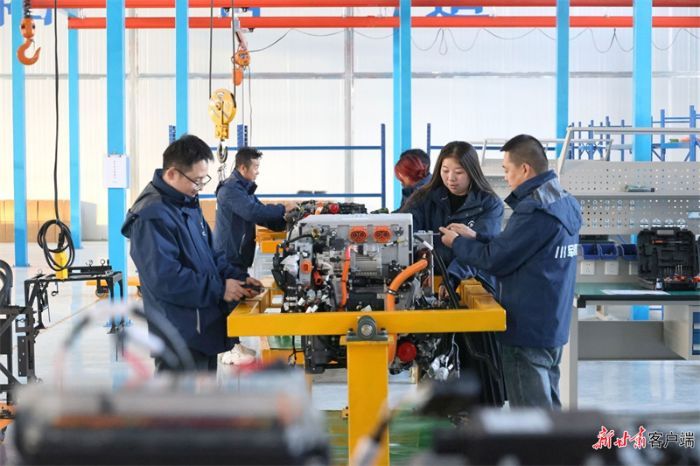 川軍氫能(慶陽(yáng))科技有限公司工作人員檢測(cè)氫燃料電池發(fā)動(dòng)機(jī)。