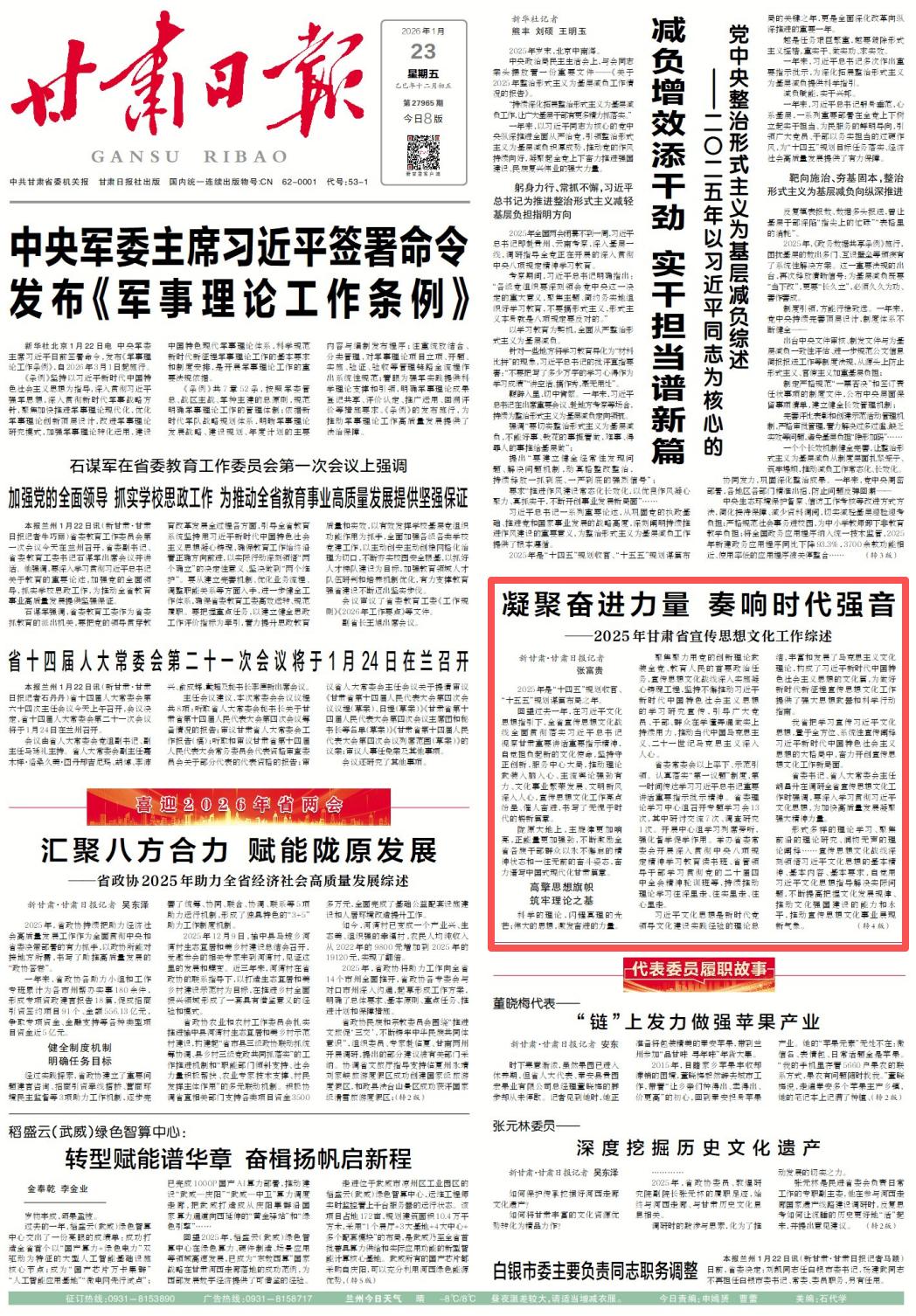 隴原大地上,主旋律更加響亮,正能量更加強勁,不斷激勵全省各族干部群眾以永不懈怠的精神狀態(tài)和一往無前的奮斗姿態(tài),奮力譜寫中國式現(xiàn)代化甘肅篇章。