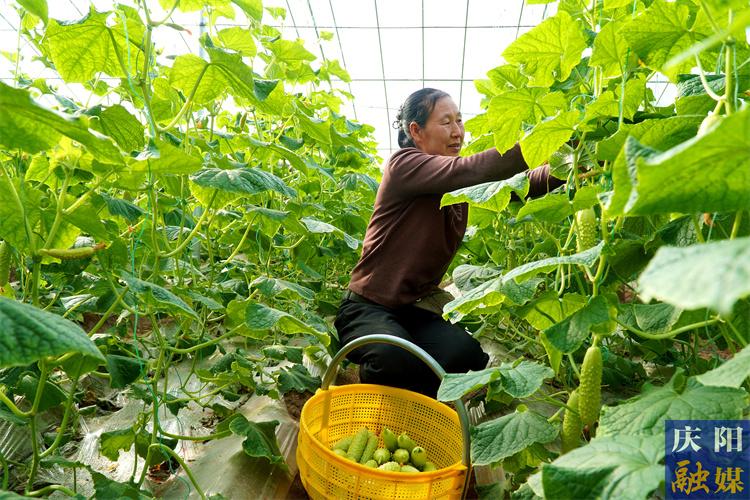 ▲合水縣板橋鎮(zhèn)白黃瓜種植產(chǎn)業(yè)園內(nèi),工人采摘成熟的白黃瓜。