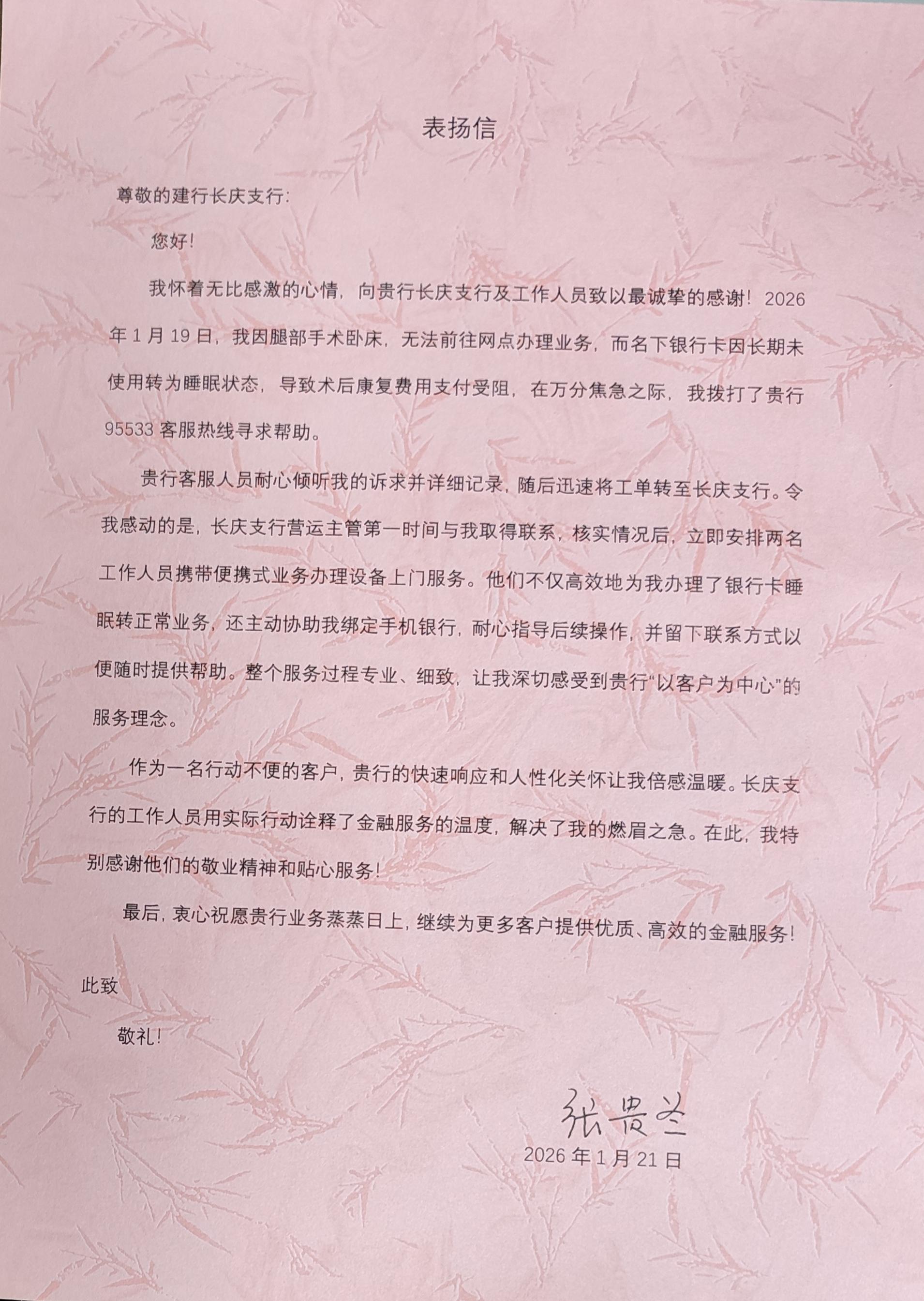 “本來以為要等很久,沒想到銀行這么快就上門解決了問題,真的太感謝了!”業(yè)務辦結(jié)后,張某對長慶支行工作人員的專業(yè)、高效和充滿人情味的服務給予了高度評價。