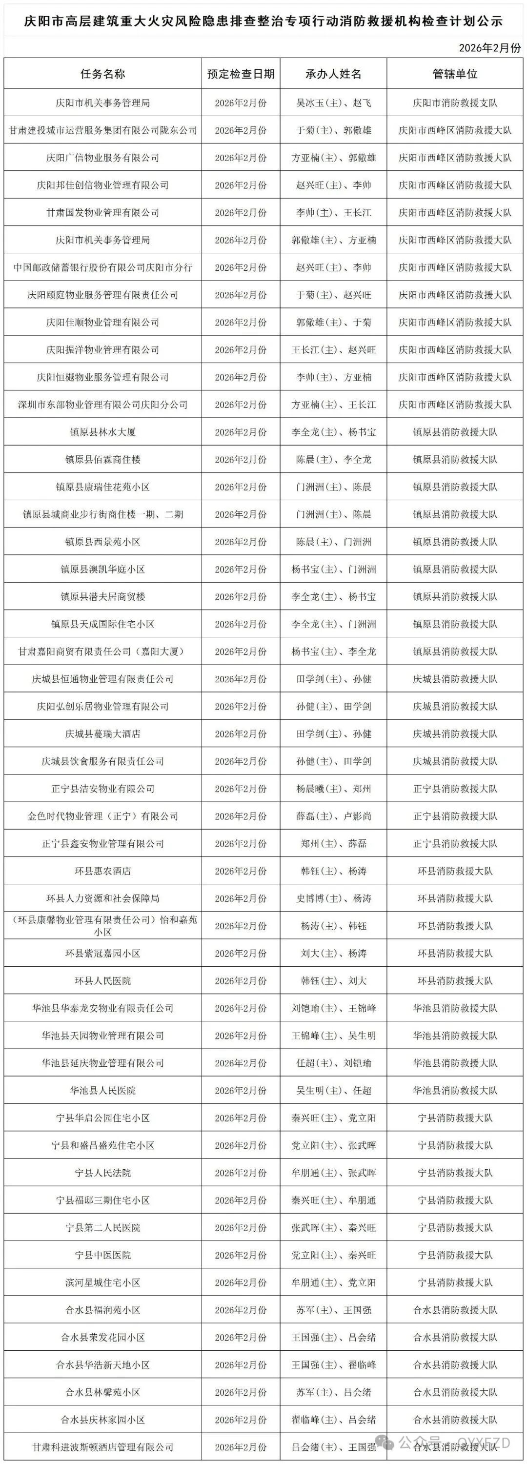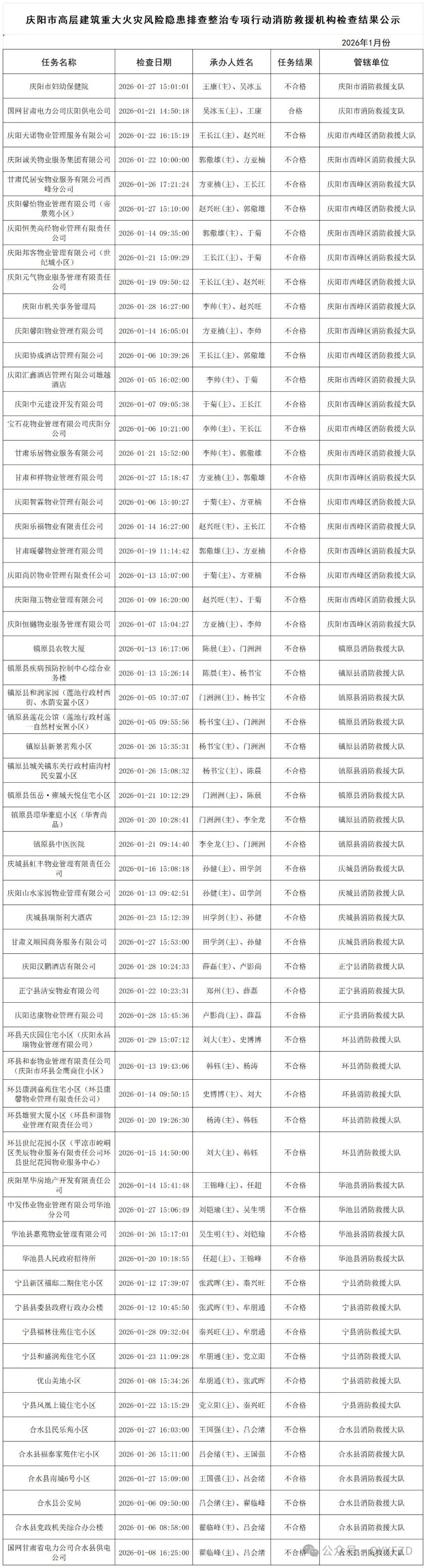 為貫徹落實(shí)國(guó)務(wù)院安委會(huì)和省、市安委會(huì)關(guān)于開展高層建筑重大火災(zāi)風(fēng)險(xiǎn)隱患排查整治專項(xiàng)行動(dòng)的部署,現(xiàn)將慶陽市高層建筑重大火災(zāi)風(fēng)險(xiǎn)隱患排查整治專項(xiàng)行動(dòng)消防救援機(jī)構(gòu)1月份檢查結(jié)果和2月份檢查計(jì)劃公示如下: