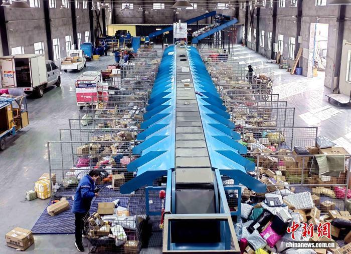 民勤電商物流產(chǎn)業(yè)園內(nèi), 特色年貨快件高效集散,實現(xiàn)雙向暢通。(資料圖)榮小勤 攝