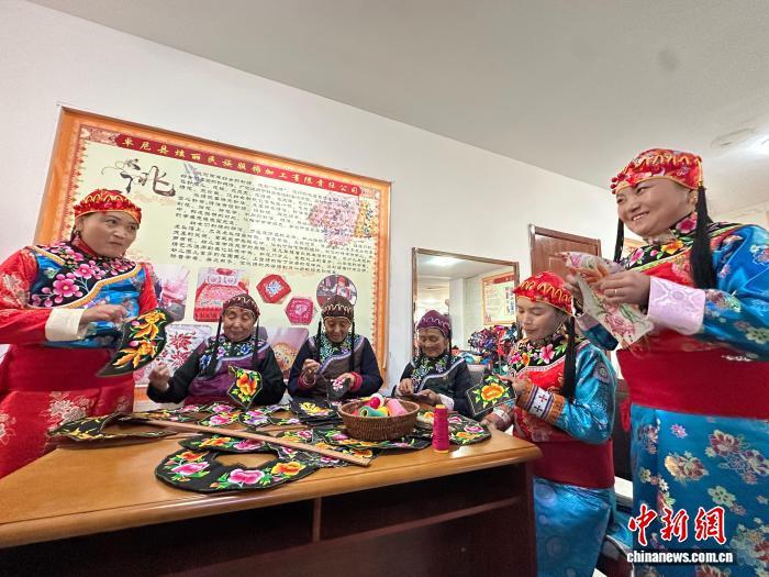 2月1日,在殷保朝的工作室里,繡娘們正在趕制“三格毛”服飾。中新社記者馮志軍攝