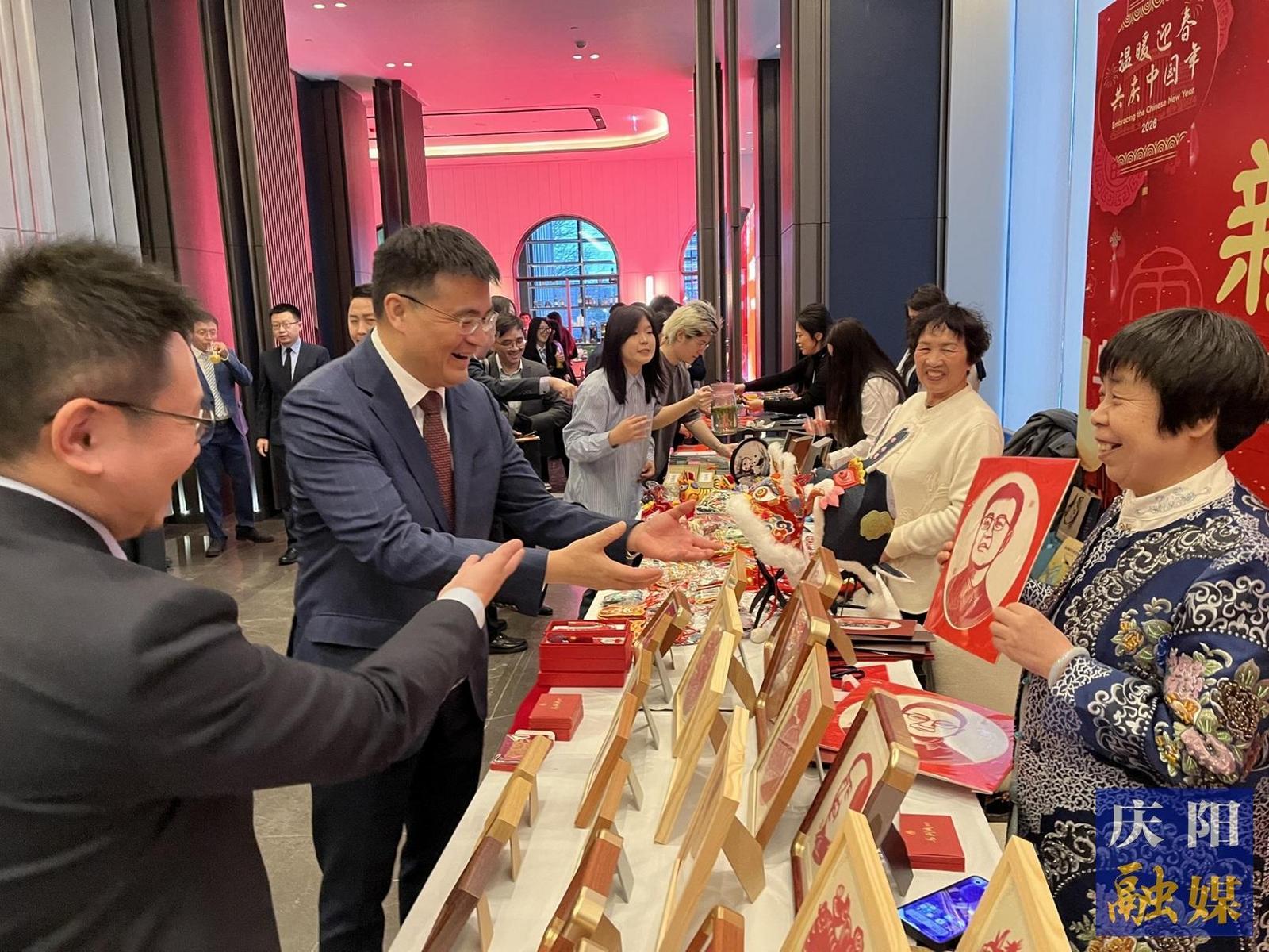 新春會現(xiàn)場張燈結彩,以喜慶紅色為主色調,融入豐富中國傳統(tǒng)文化元素,洋溢著熱烈祥和的節(jié)日氛圍。馬路、左煥茸兩位老師代表慶陽登臺展示特色香包與剪紙技藝,贏得全場陣陣掌聲。新春集市活動現(xiàn)場,慶陽非遺展區(qū)人氣爆棚,精美絕倫的香包、剪紙、皮影不到一小時便被搶購大半。中國駐烏茲別克斯坦大使于俊參觀展位時,對慶陽特色民俗文創(chuàng)產品給予高度評價,尤其對馬路老師創(chuàng)作的肖像剪紙給予充分肯定。
