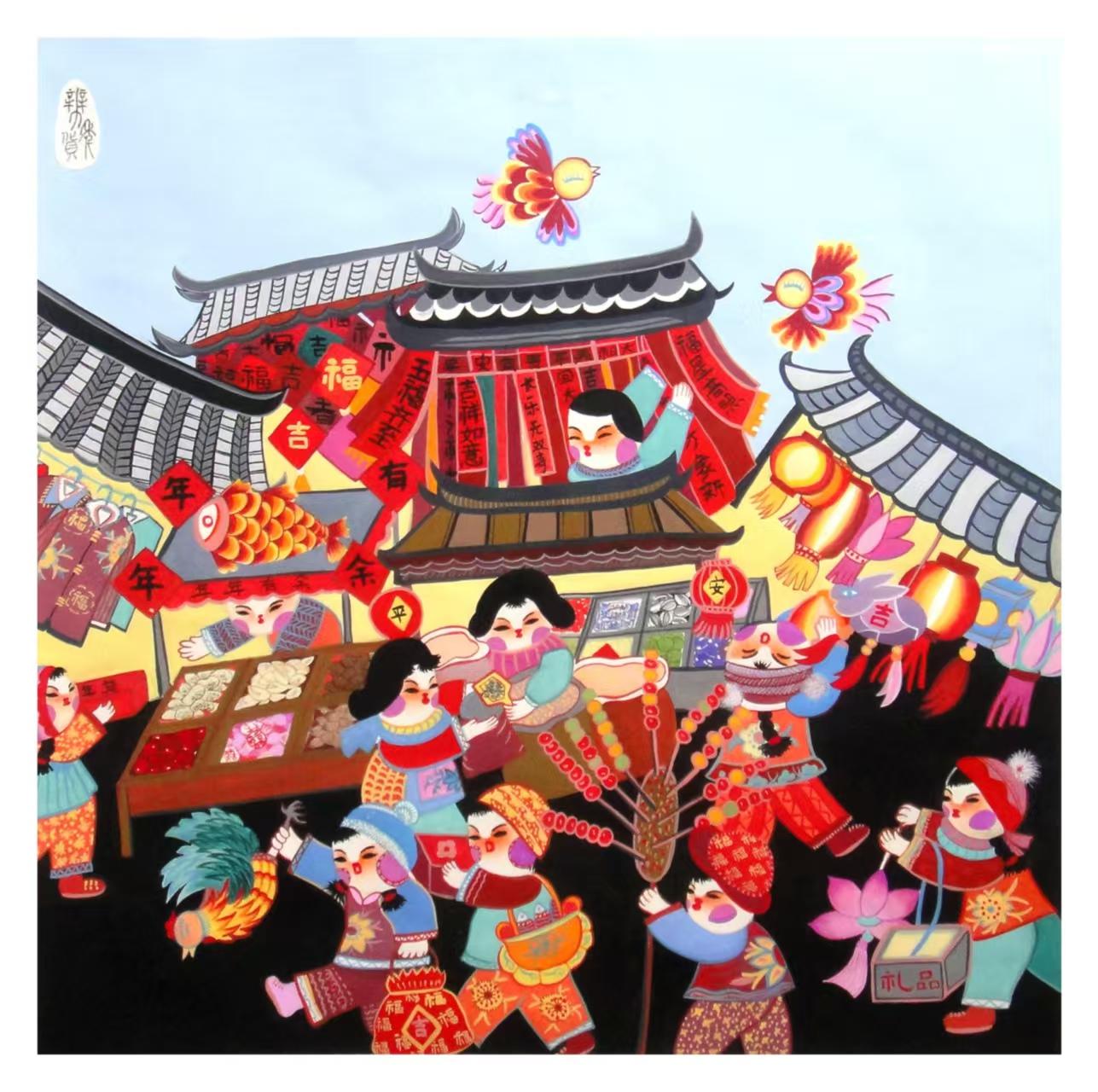 (備年貨):春節(jié)集市熱鬧非凡,紅彤彤的燈籠、喜慶的春聯(lián)福字掛滿(mǎn)攤位。大人小孩穿梭其間選購(gòu)年貨,手中的糖葫蘆與臉上的笑容,勾勒出備年貨時(shí)的歡喜氛圍。