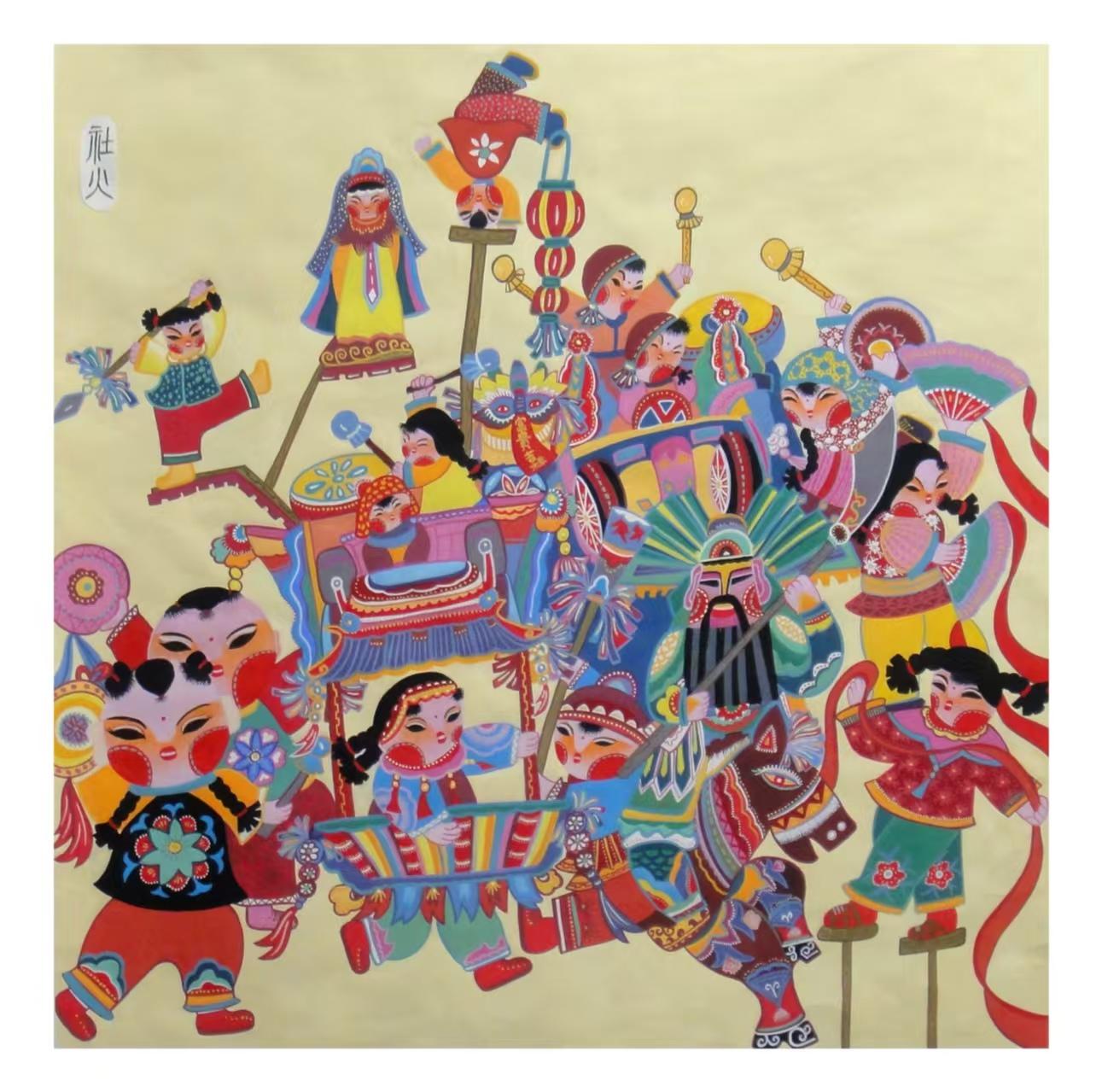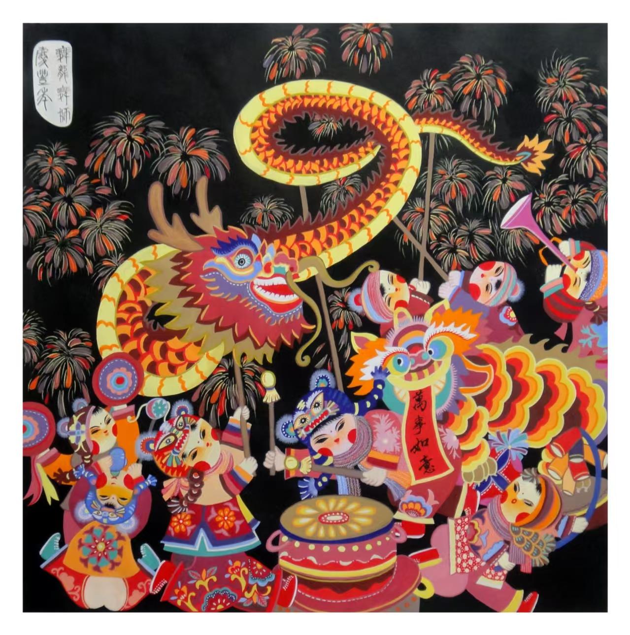 除夕夜,祭祖香火溫暖院落,長(zhǎng)輩以紅包傳遞祝福,闔家圍坐吃年夜飯、守歲話(huà)家常,鞭炮聲聲辭舊迎新。走親訪友、互道祝福的暖意里,隴原社火的熱鬧如期而至——正如農(nóng)民畫(huà)《社火》所繪,高蹺、旱船、秧歌隊(duì)穿梭街巷,演員們身著彩衣、扮相鮮活,鑼鼓聲、歡笑聲交織成最動(dòng)人的新春樂(lè)章。元宵之夜花燈璀璨,舞龍舞獅將團(tuán)圓氛圍推向高潮,《群龍舞獅慶豊年》中,金黃巨龍翻騰飛舞,彩獅騰躍歡鬧,漫天煙花映照下,人們笑臉盈盈,盡顯隴原兒女的喜慶歡騰。