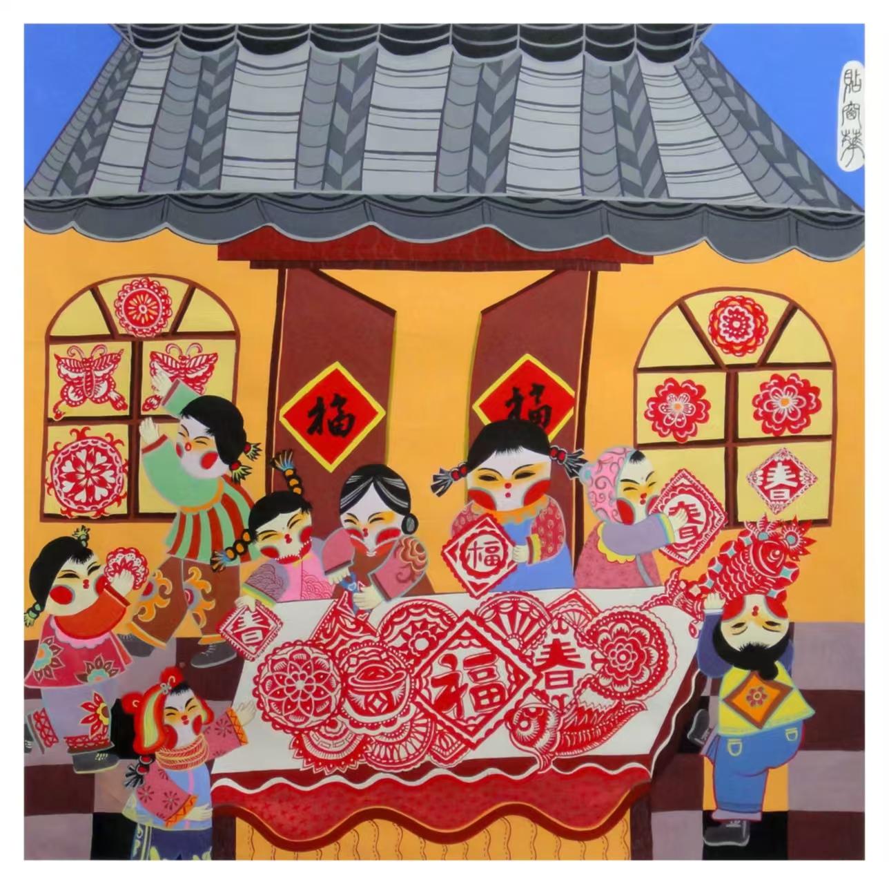 (剪窗花):農(nóng)家炕頭,巧手婦女與孩子們圍坐一起剪窗花、刻福字。紅紙翻飛間,一幅幅寓意吉祥的窗花躍然紙上,為新春增添了濃濃的喜慶色彩。
