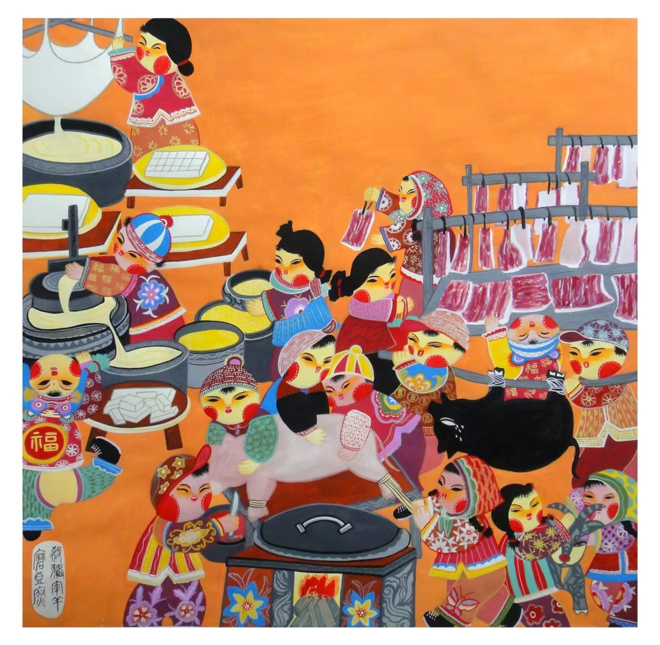 甘肅農(nóng)民書(shū)畫(huà)研究會(huì)終身名譽(yù)會(huì)長(zhǎng)高存弟說(shuō),這組畫(huà)作色彩明艷、構(gòu)圖飽滿(mǎn),生動(dòng)再現(xiàn)了祭灶、備年、貼春聯(lián)、鬧社火、燎疳等經(jīng)典場(chǎng)景,用鄉(xiāng)土丹青定格了甘肅人記憶中最熱烈、最醇厚的年俗年味。