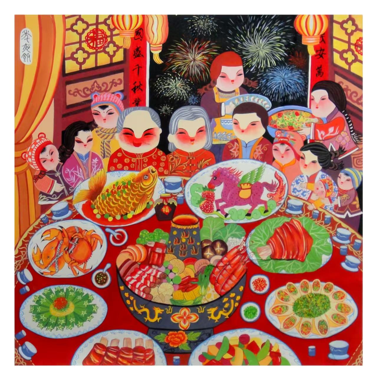 (年夜飯):除夕夜,闔家團(tuán)圓享盛宴。圓桌之上,魚(yú)象征“年年有余”,火鍋寓意“紅紅火火”,三代同堂圍坐舉杯,在煙花映照下,定格了最幸福的團(tuán)圓時(shí)刻。
