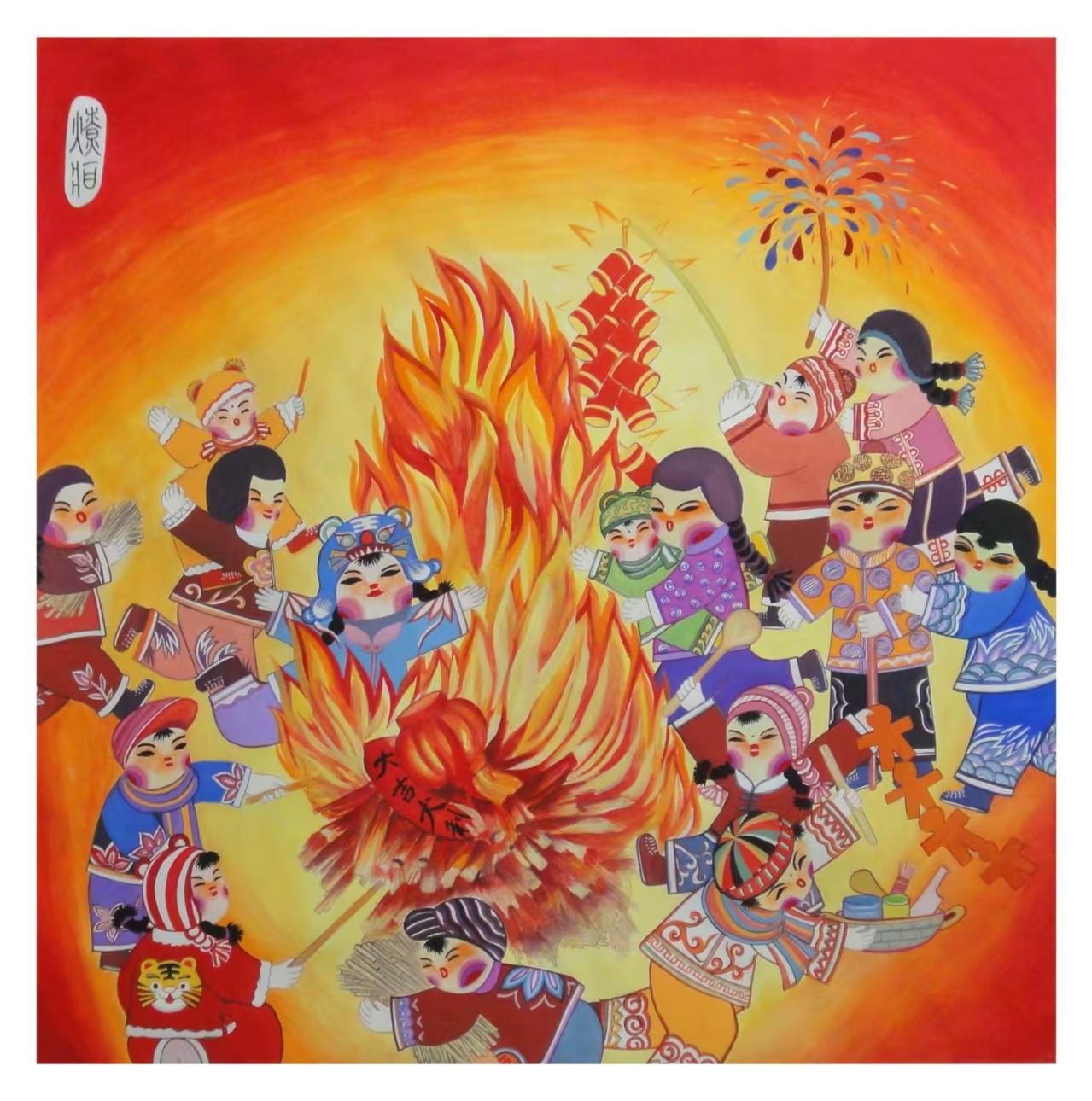 正月二十三燎疳,為隴原春節(jié)畫(huà)上最熱烈的句號(hào)。這幅核心場(chǎng)景在農(nóng)民畫(huà)《燎疳》中被展現(xiàn)得淋漓盡致:熊熊篝火躍動(dòng)升騰,紅橙火焰裹挾著“大吉大利”的美好期許,男女老少身著節(jié)日盛裝,圍著火堆縱情跳躍,孩童手持煙花歡呼雀躍,虎頭帽、花棉襖勾勒出最純真的喜悅。人們以火祛病、祈福納祥,期盼新一年身康體健、日子紅紅火火。在篝火升騰與歡聲笑語(yǔ)中,年的喜慶落下帷幕,新一年的希望與生機(jī),正隨這熾熱的煙火,在隴原大地上蓬勃啟航。