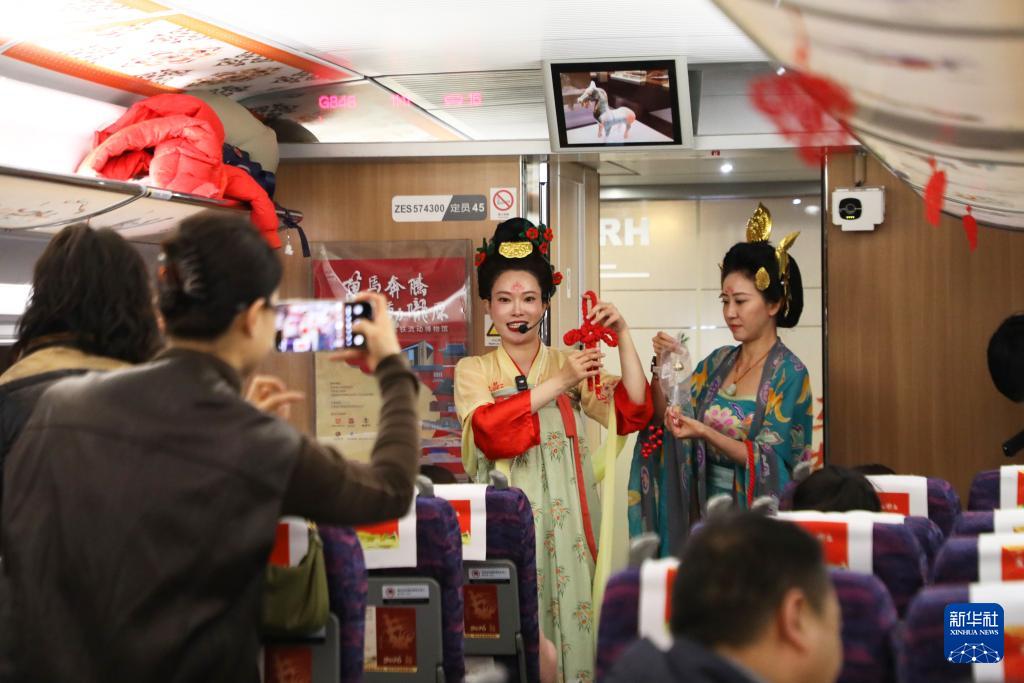 2月9日,在G848次列車上,武威市博物館工作人員向旅客贈送文創(chuàng)禮品。新華社記者 張智敏 攝