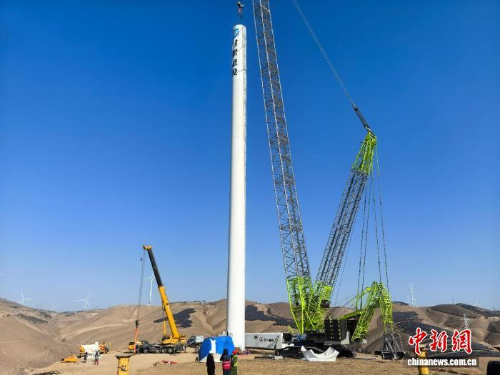 圖為慶陽(yáng)綠電聚合新能源項(xiàng)目風(fēng)機(jī)塔筒吊裝場(chǎng)景?!「拭C電投集團(tuán)供圖
