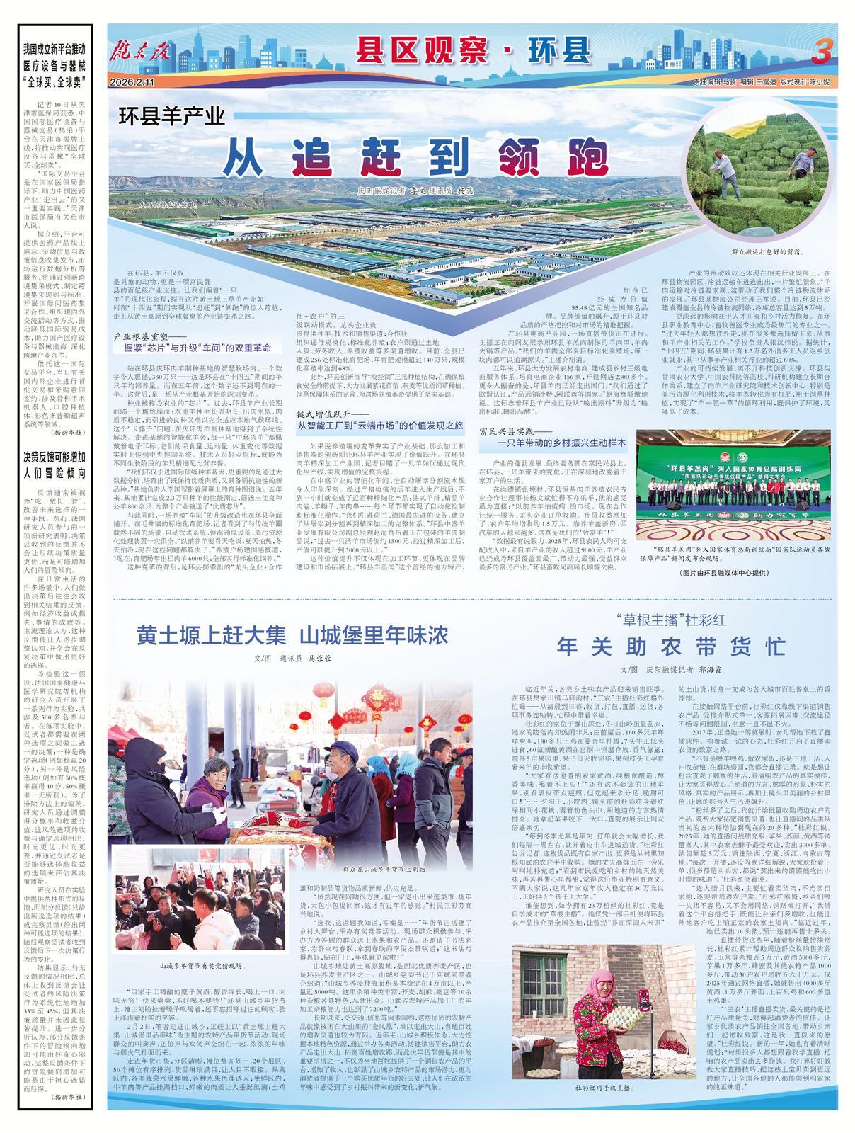 臨近年關(guān),各類鄉(xiāng)土味農(nóng)產(chǎn)品迎來銷售旺季。在環(huán)縣樊家川鎮(zhèn)馬驛溝村,“三農(nóng)”主播杜彩紅格外忙碌——從清晨到日暮,收貨、打包、直播、送貨,各項事務連軸轉(zhuǎn),忙碌中帶著幸福。