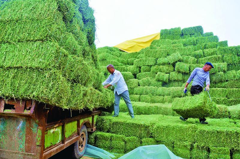 收割運回的苜蓿堆積如山。