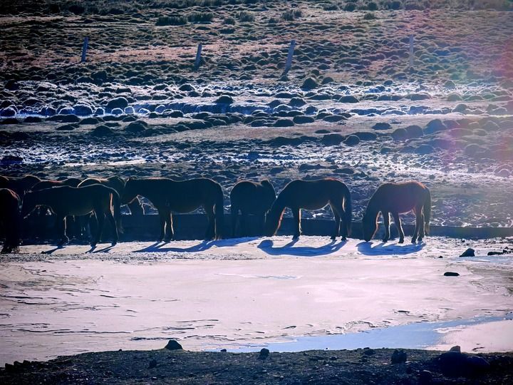 上午10點,我跟著大隊馬群,繞過冰封沉寂的鸞鳥湖,沿著祁連山融雪匯成的溪流向上游走,眼前便出現(xiàn)一段仍在流動的河面。寒冬未能將其鎖住,水聲潺潺,水面清亮,成了馬群在寒冬中難得的飲水處。