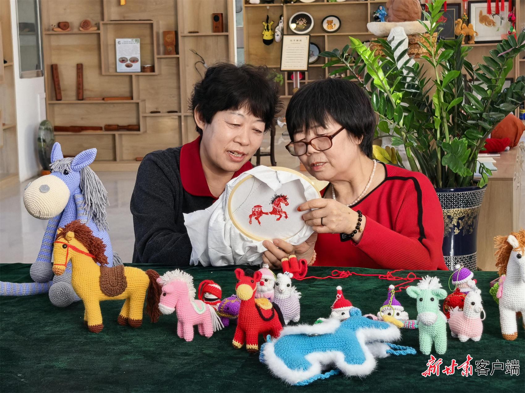 在山丹縣非物質(zhì)文化遺產(chǎn)研發(fā)中心,市級(jí)非遺刺繡傳承人車靜捏著針,和縣級(jí)非遺刺繡傳承人陳秀英討論刺繡的走筆、圖案和顏色:“馬尾巴用黑線更精神,馬鞍綠色好一點(diǎn),但不能太突兀,要把背上的元寶顯出來?!?/p>