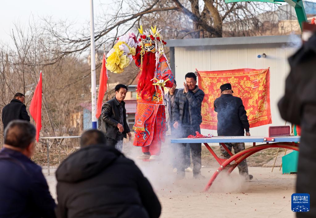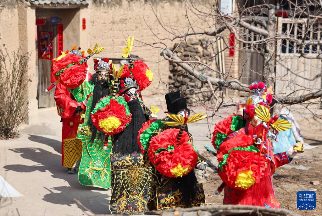 2月21日,在甘肅省靜寧縣賈河鄉(xiāng)侯山村,社火隊(duì)員在表演。新華社發(fā)(侯崇慧攝)