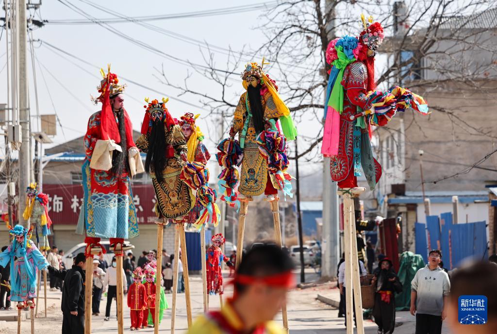 2月21日,在甘肅省靜寧縣李店鎮(zhèn)五方河村,社火隊(duì)員在表演踩高蹺。新華社發(fā)(侯崇慧攝)