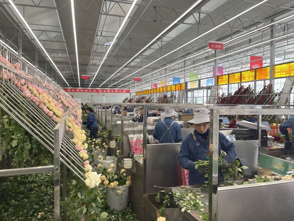 生產(chǎn)車間內(nèi),一簇簇玫瑰花正開得熱鬧。包裝流水線上,38歲的張婷婷熟練地將玫瑰花分出等級,并整理打包。