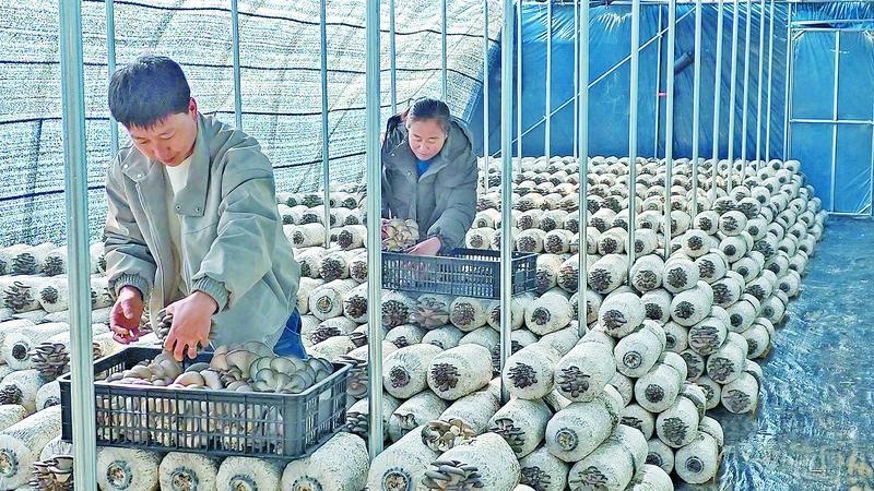 鄢旗坳村的菌菇大棚內(nèi),村民在采收平菇。通訊員 王春燕 攝