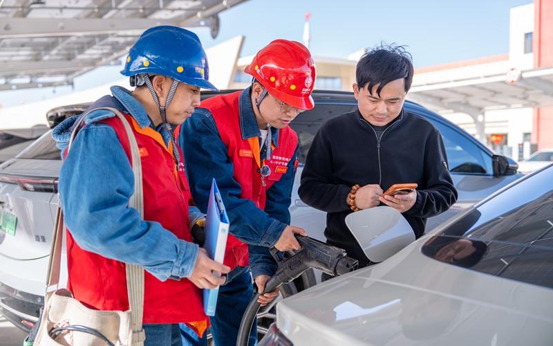 國網(wǎng)白銀供電公司工作人員對會寧縣城區(qū)商圈、高速沿線的充電站進(jìn)行巡檢維護(hù),保障春節(jié)期間群眾綠色出行需求。查代輝攝